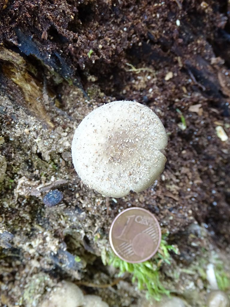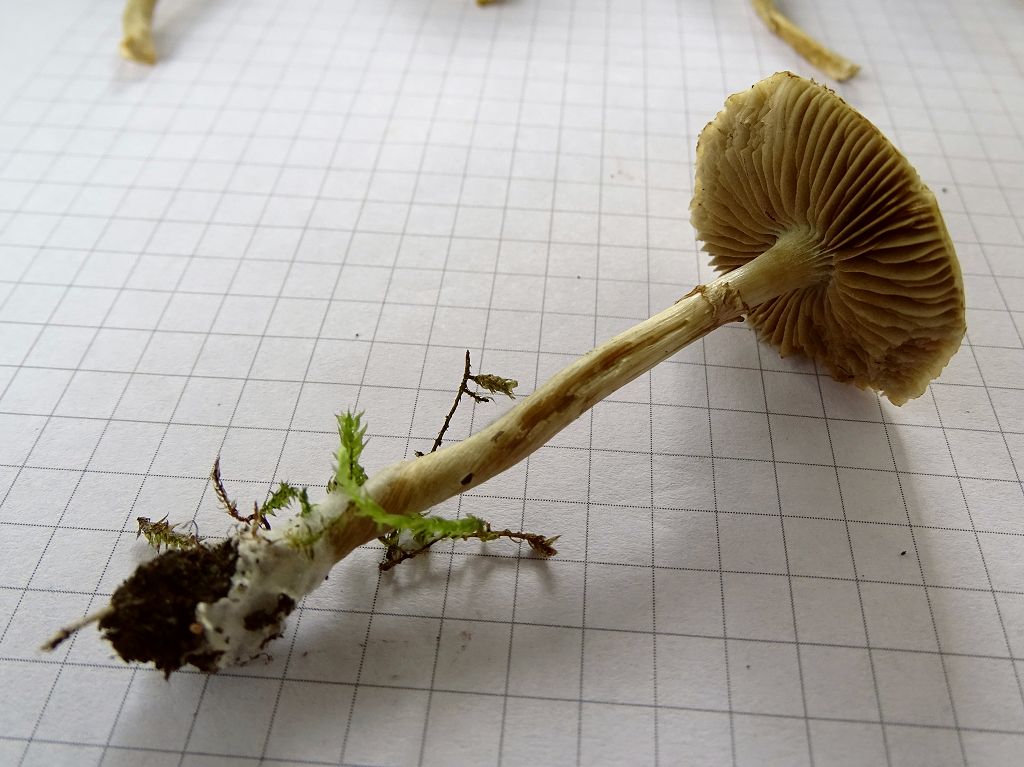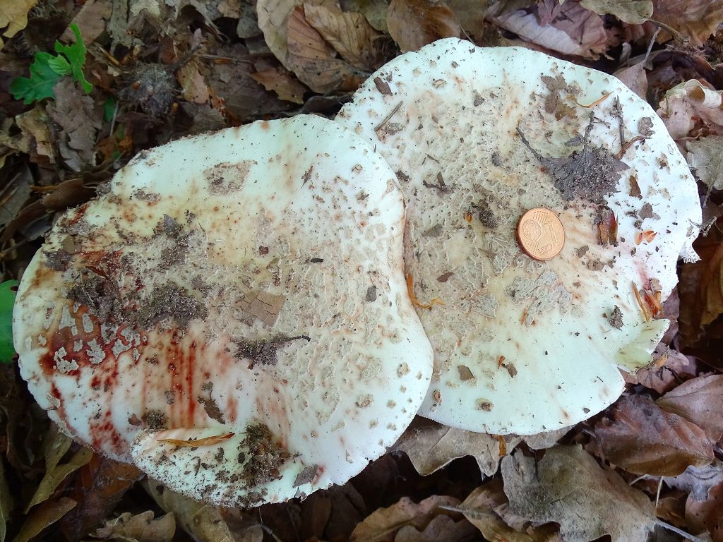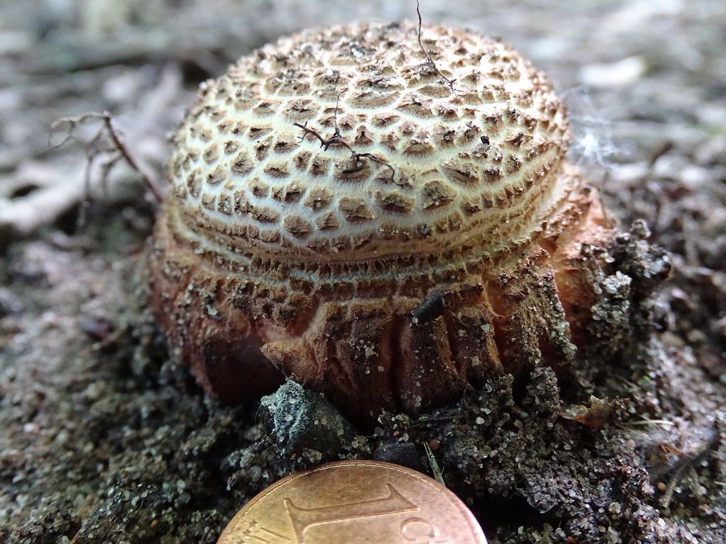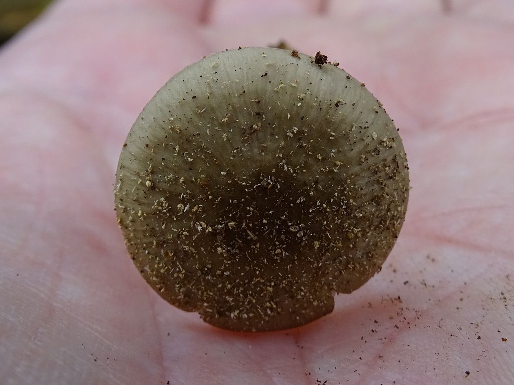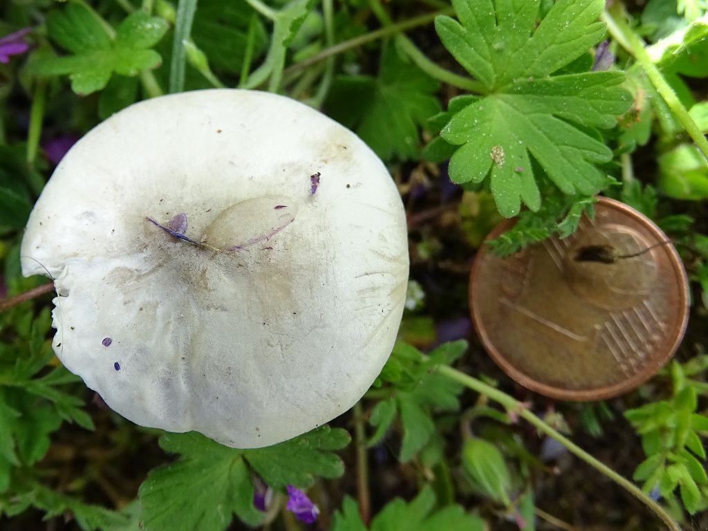 Hut: beige, glatt, matt, Mitte dunkler, großflächig mit Velumresten bedeckt, Rand leicht gerieft, Huthaut abziehbar.