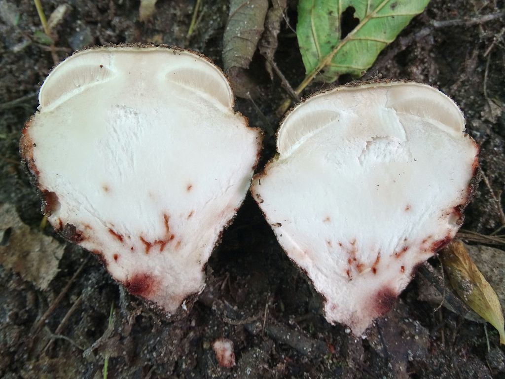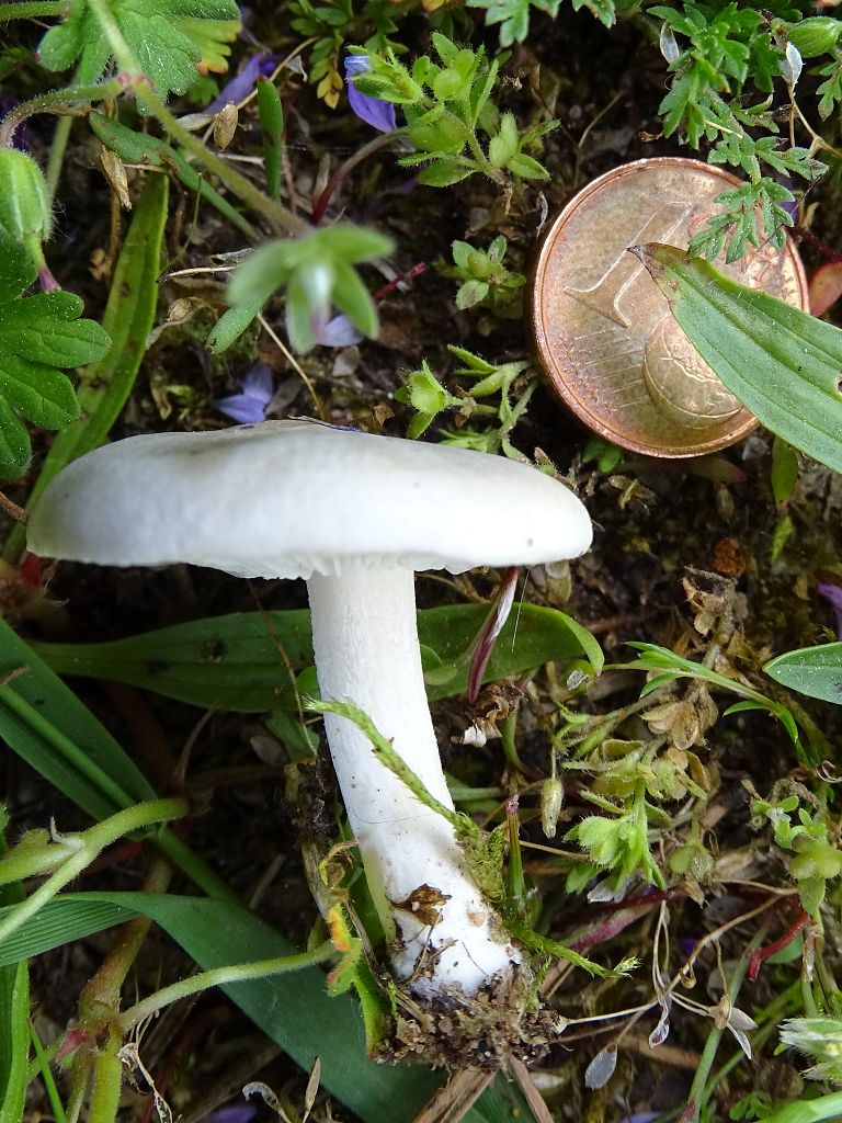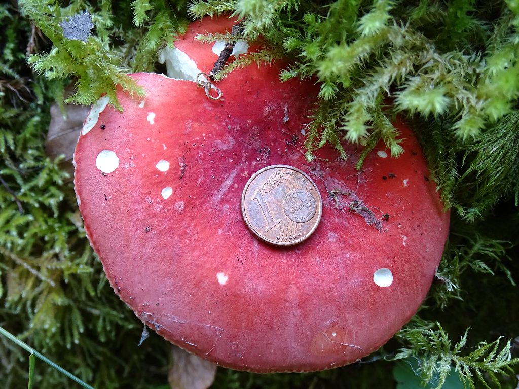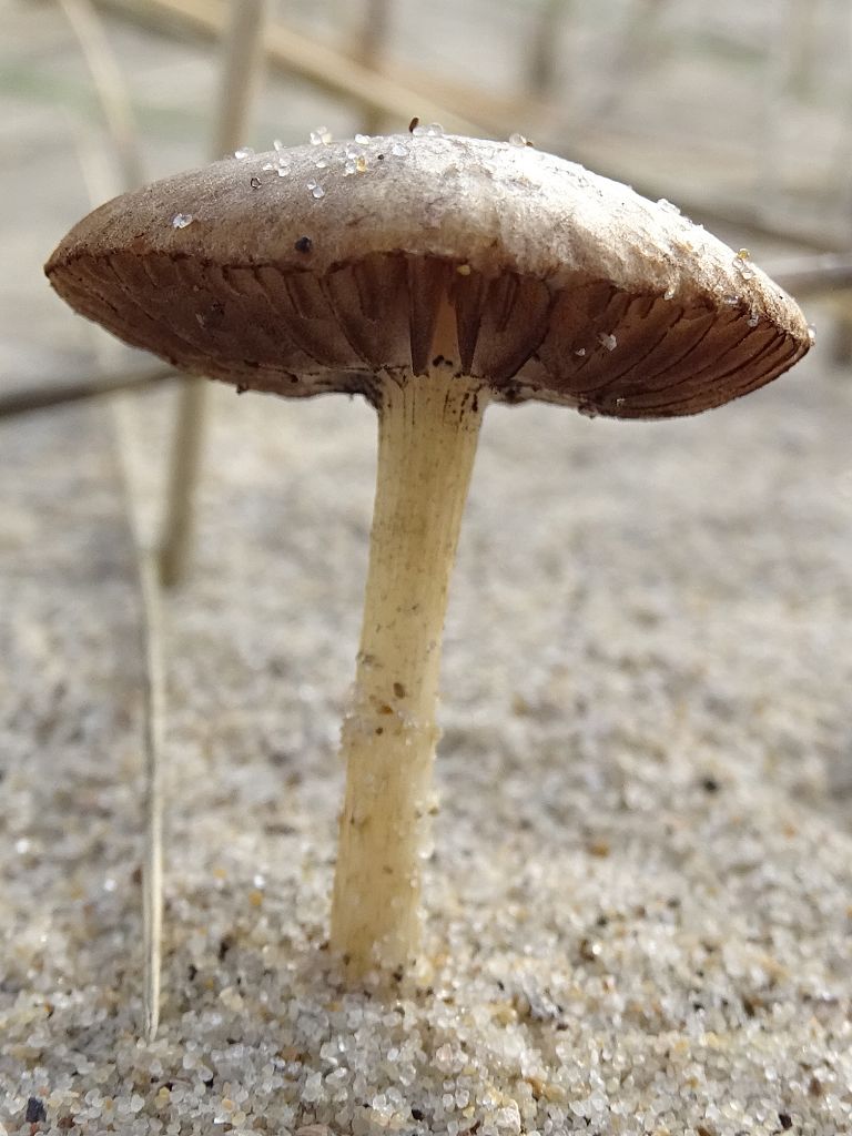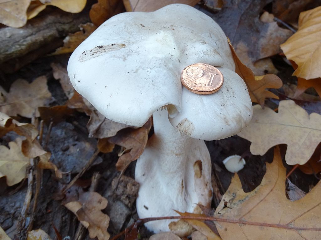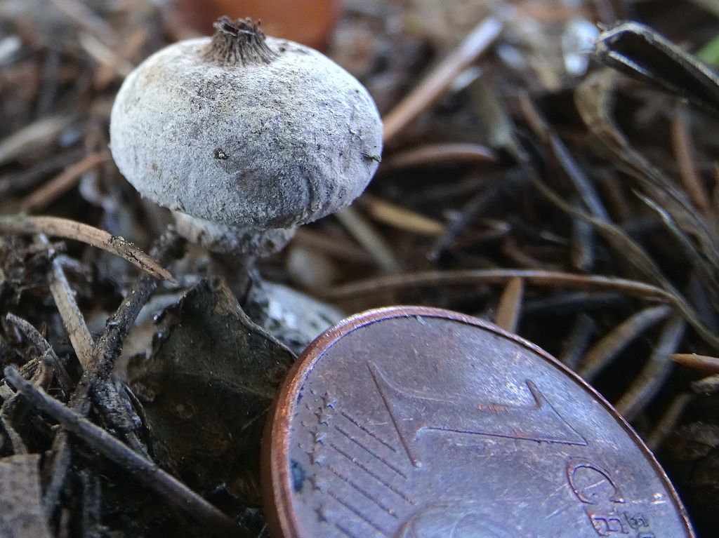 Hut: beige, glatt, matt, Mitte dunkler, großflächig mit Velumresten bedeckt, Rand leicht gerieft, Huthaut abziehbar.