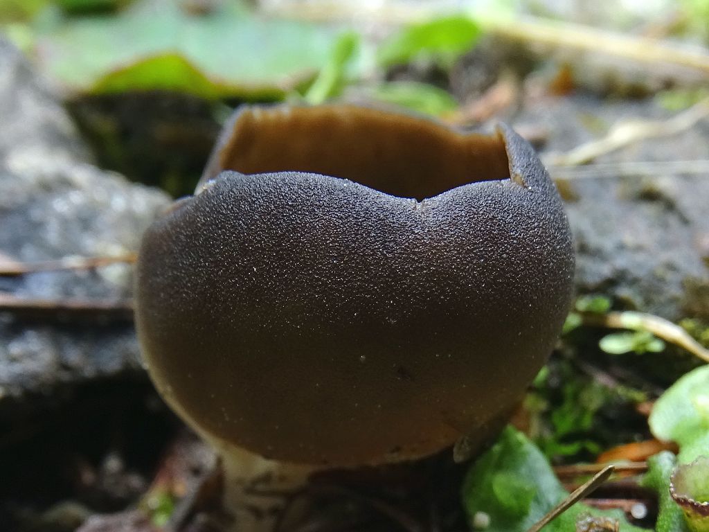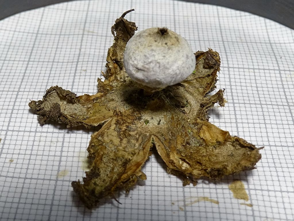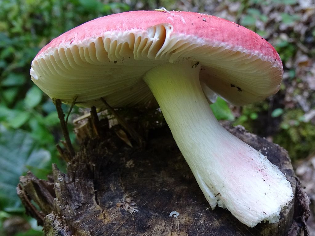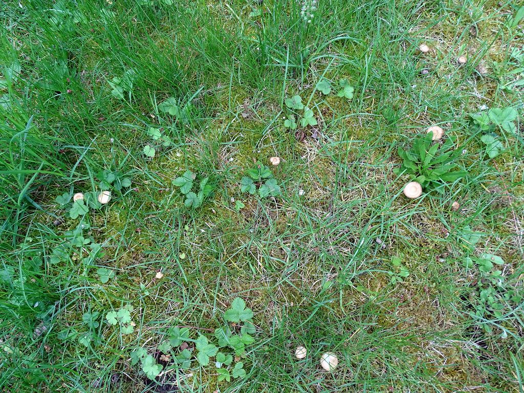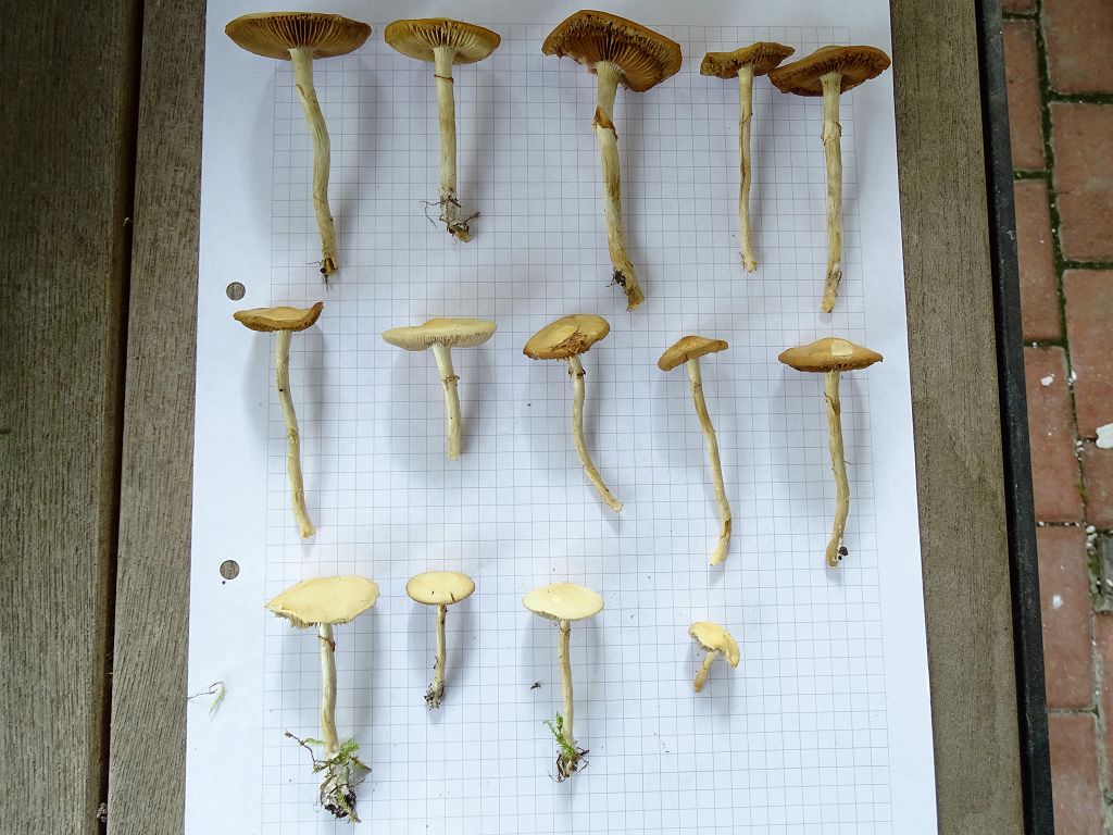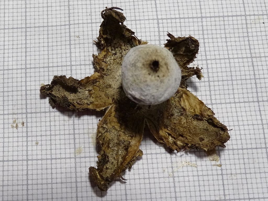 Hut: beige, glatt, matt, Mitte dunkler, großflächig mit Velumresten bedeckt, Rand leicht gerieft, Huthaut abziehbar.