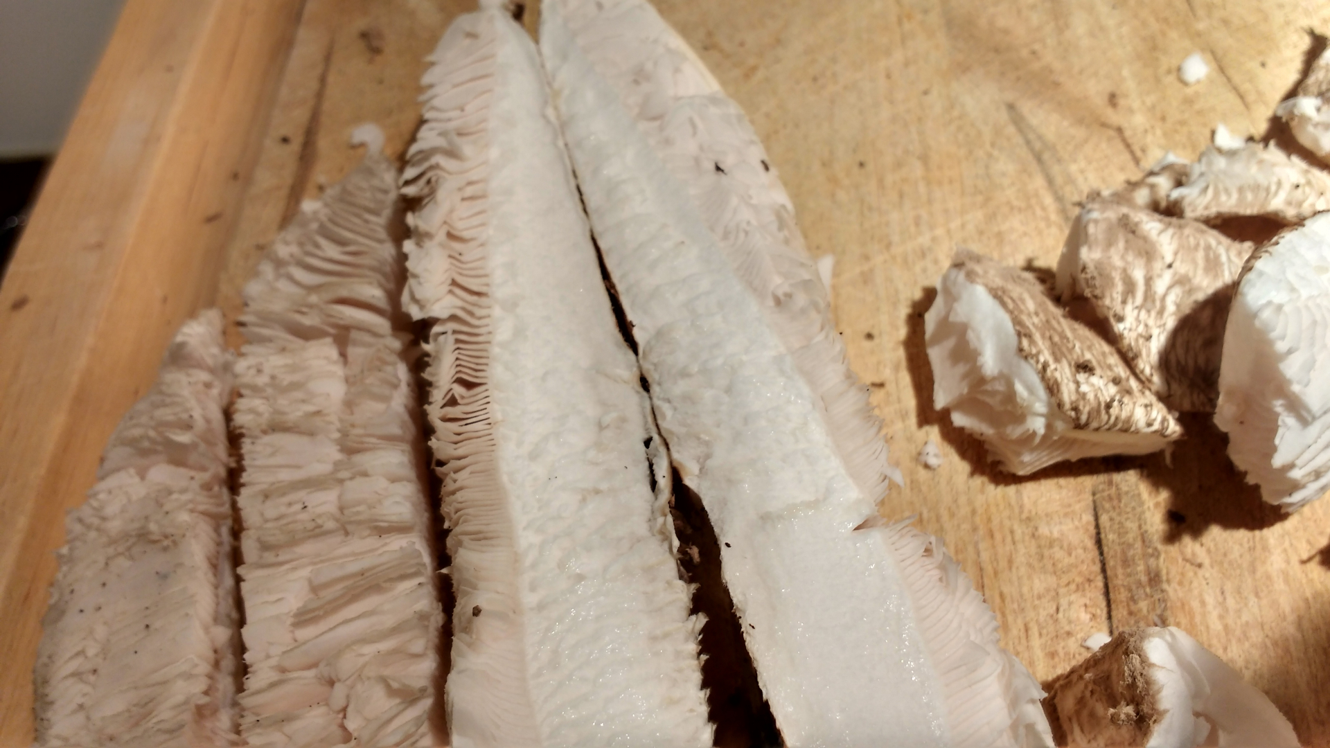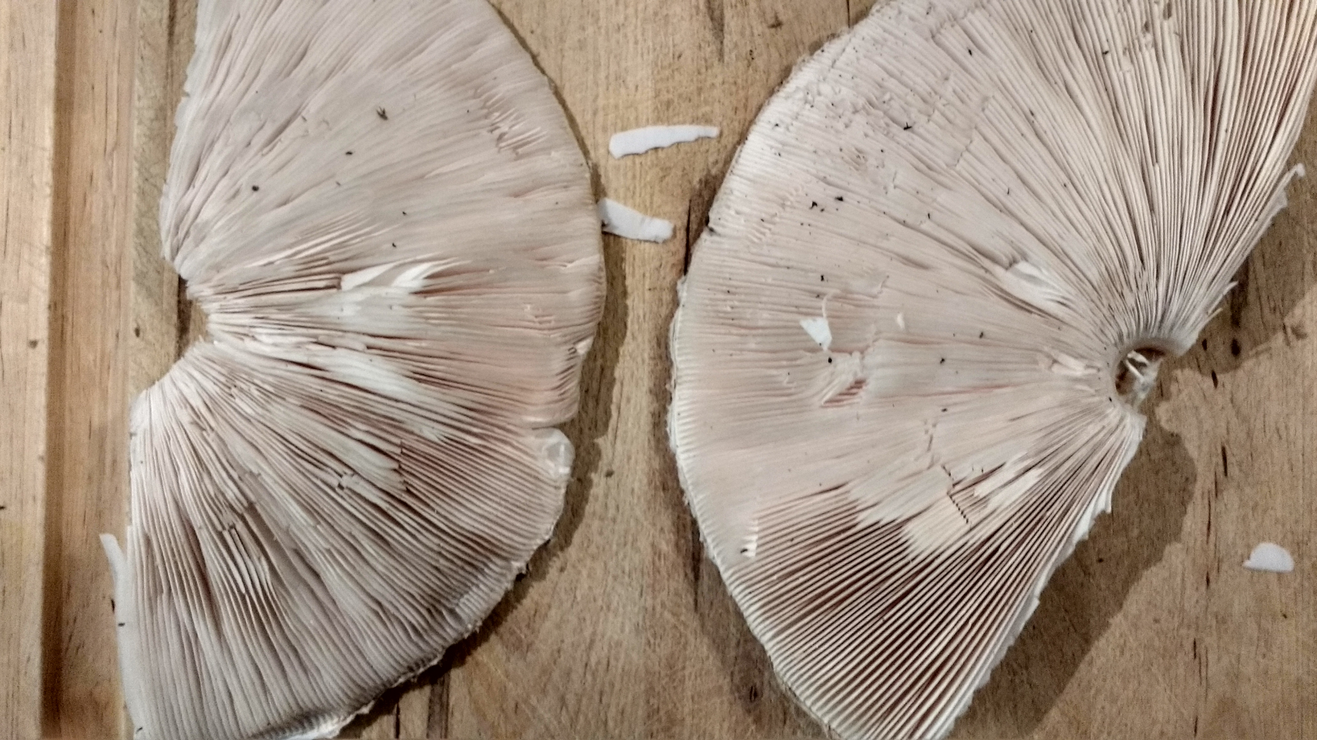 und: schwer auf den Bildern zu sehen, aber die Lamellen haben m. E. nach einen leichten rosa Schimmer ... von unten betrachtet. Wenn man ihn dann schneidet, schauen sie im Vgl zum weißen Fleisch eher cremefarben aus.Kann es das beim Parasol geben?