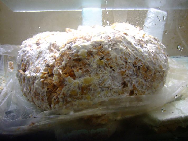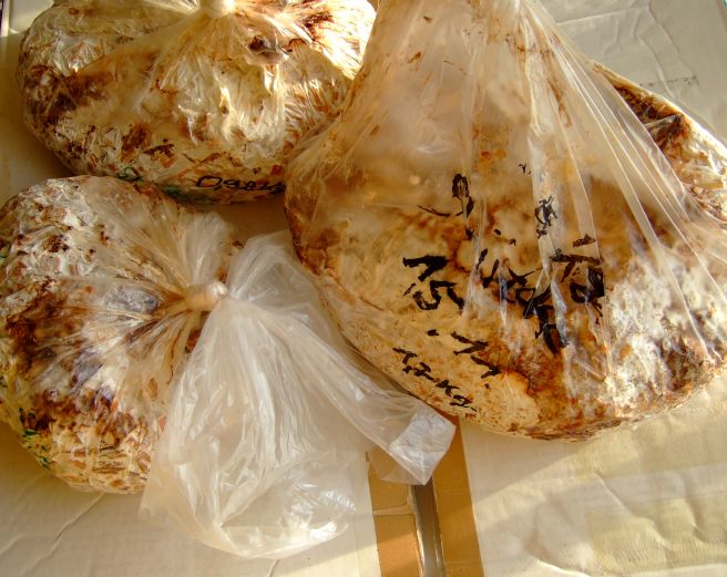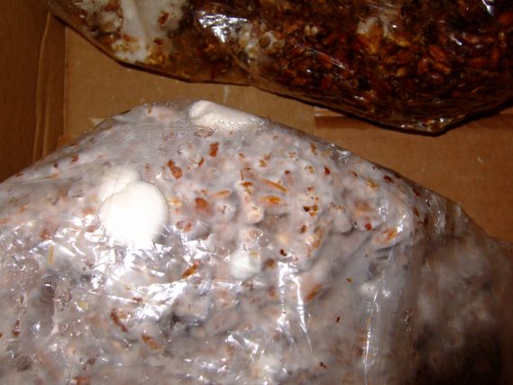 Auf dem zweiten Bild zu sehen, Shiitake im Substrat, vor drei Wochen mit Körnerbrut geimpft.