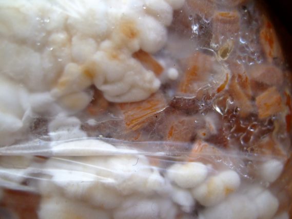 Dass mir die Reishi immer wieder kontaminiert ist, liegt vielleicht dran, dass das Körnerbrut noch nicht gut durchwachsen ist, oder ? Auf dem Bild oben ist die Brut vom Reishi, darunter Shiitake.
