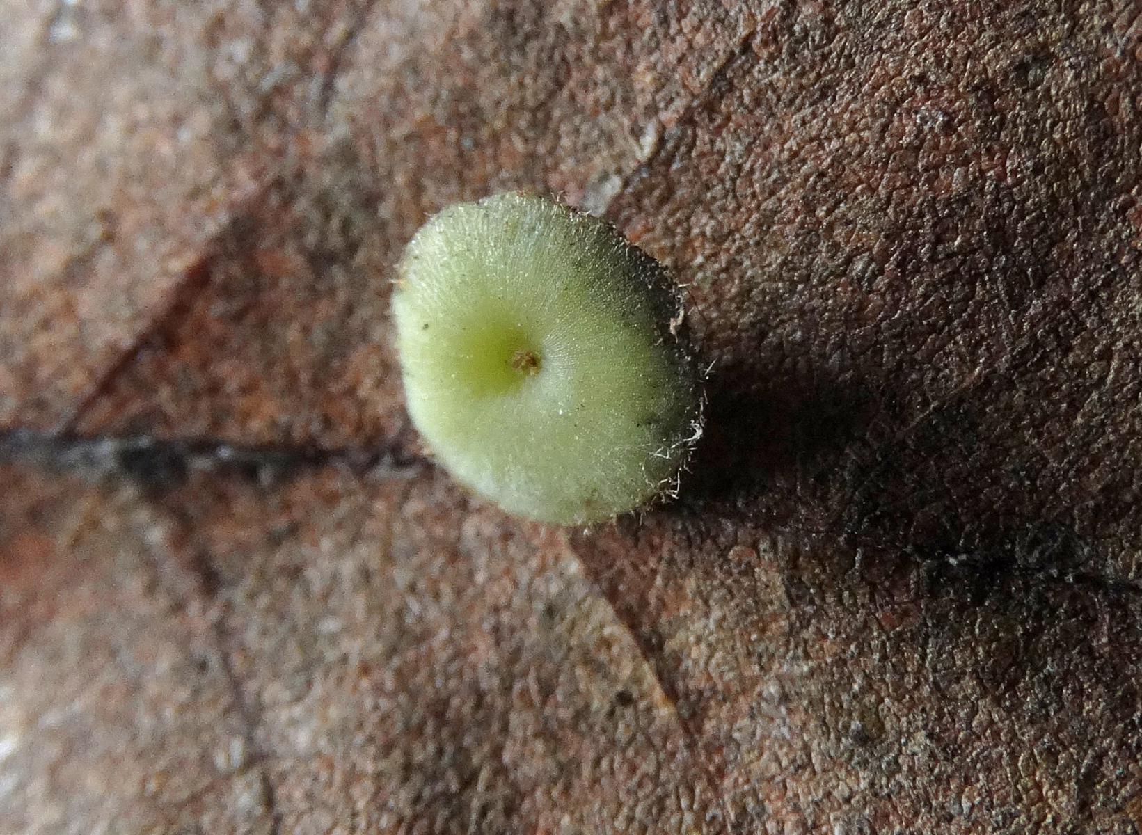 11. Den hat Papa auf einem Blatt entdeckt. Wenn es ein Pilzchen ist, dann ist es für uns ganz klar ein Erstling. Unsere Kamera hat kein Makroobjektiv, aber ich finde das Foto ok von einem Pilz, der nur 2mm gross war.