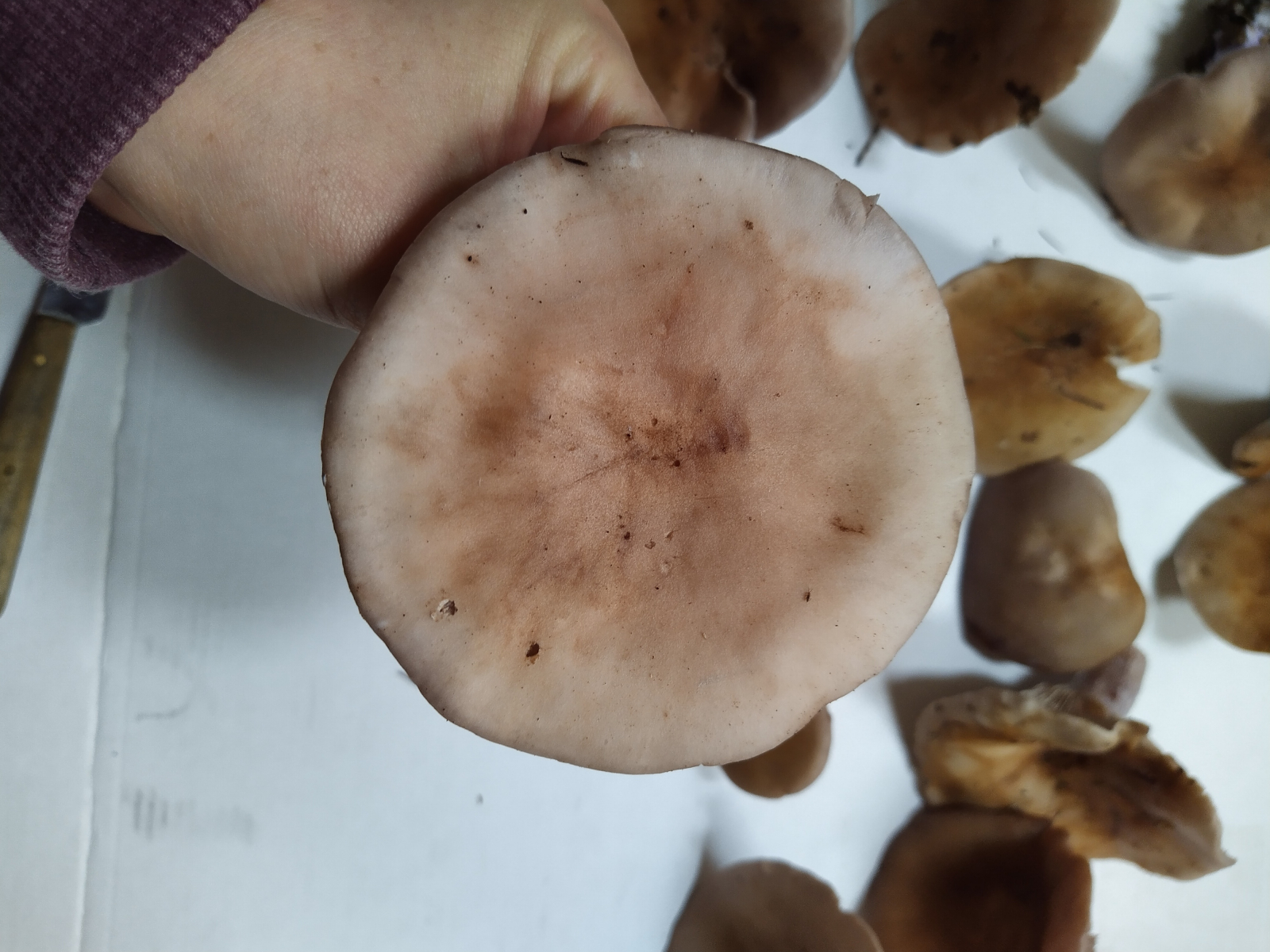 Eine große Gruppe alter Pilze war auch daneben, deren Sporenpulver war zimtfarben.