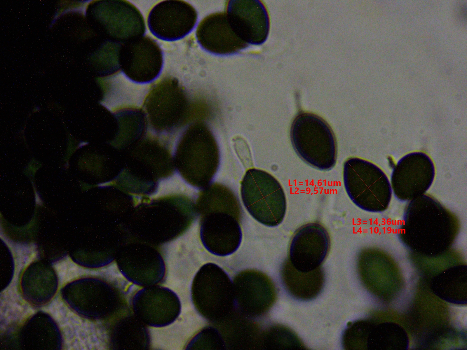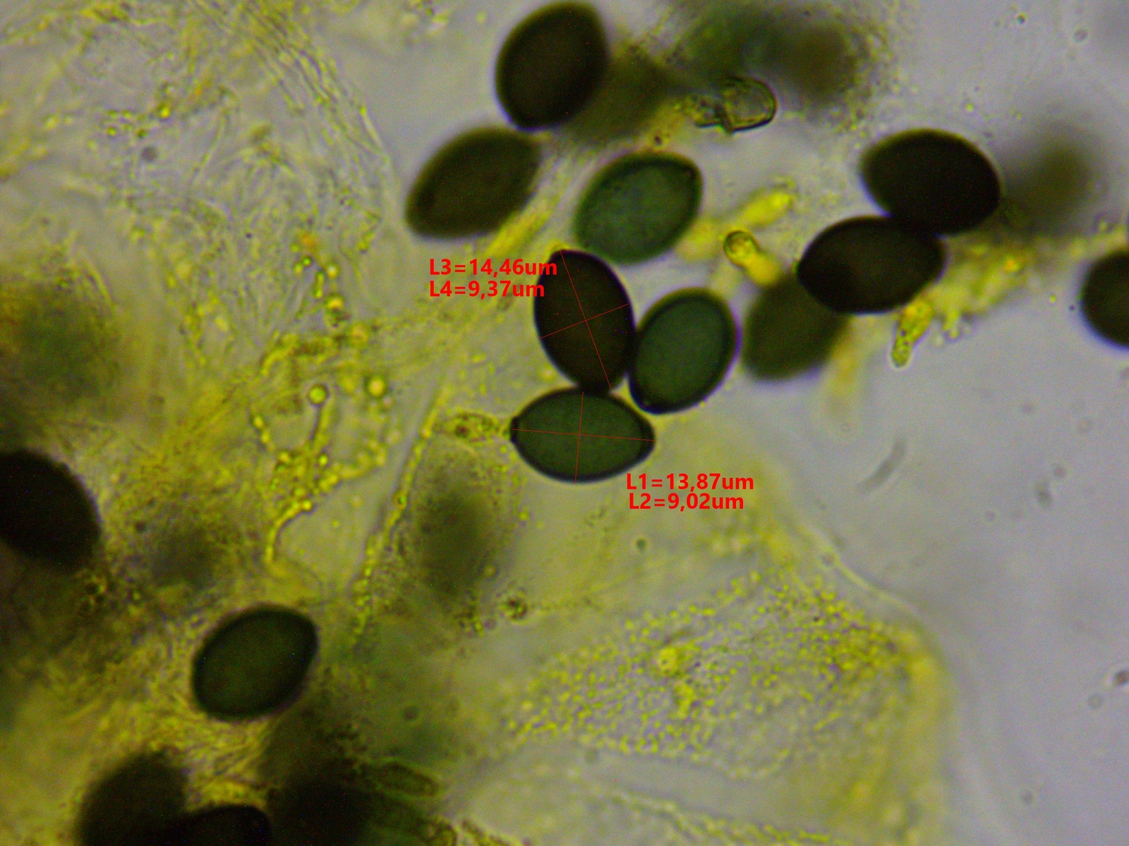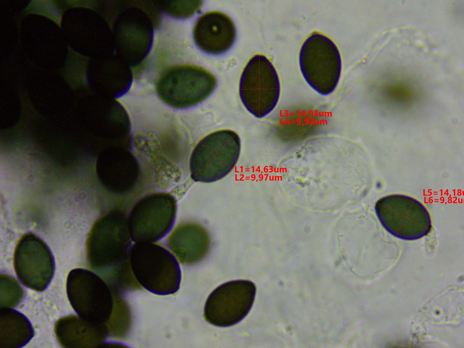 Die Sporenmaße liegen im Mittel bei 14,5 x 9,5 µm (14-15 x 9-10 µm), die Sporen wirken für mich nicht seitlich abgeflacht.