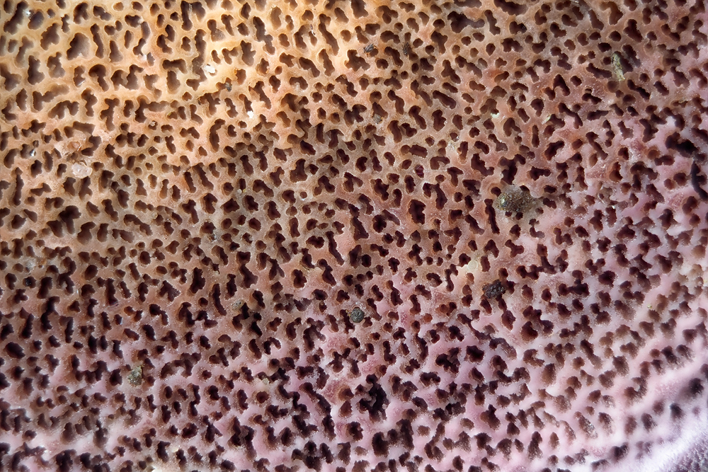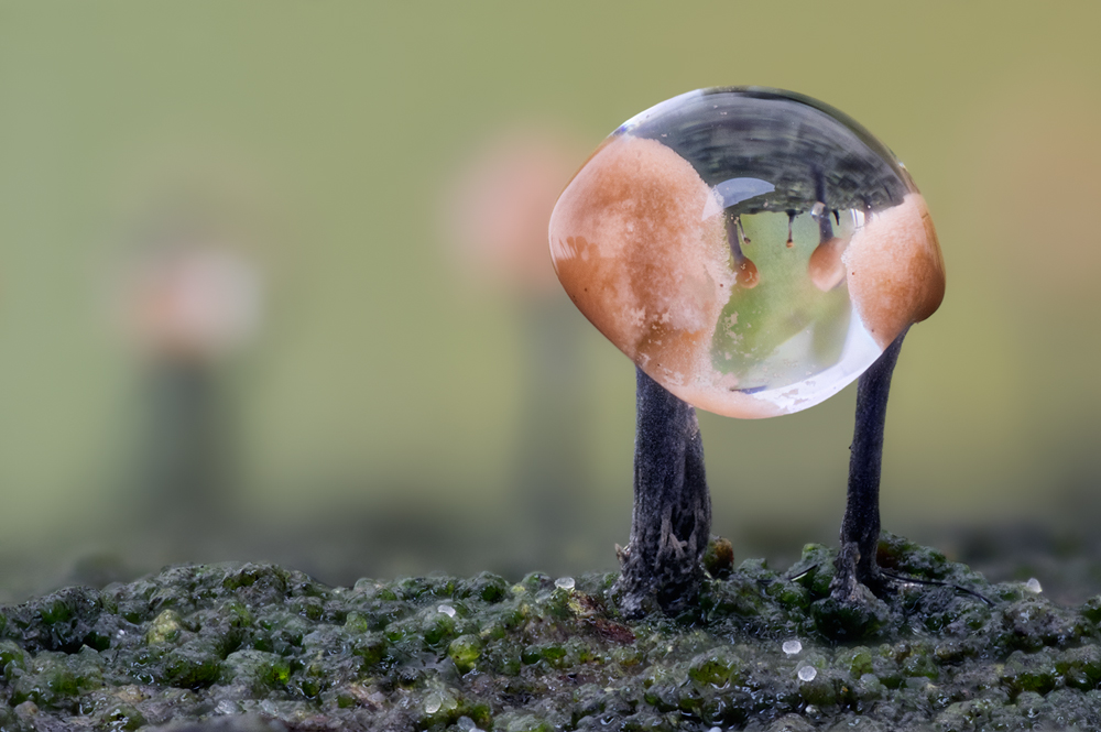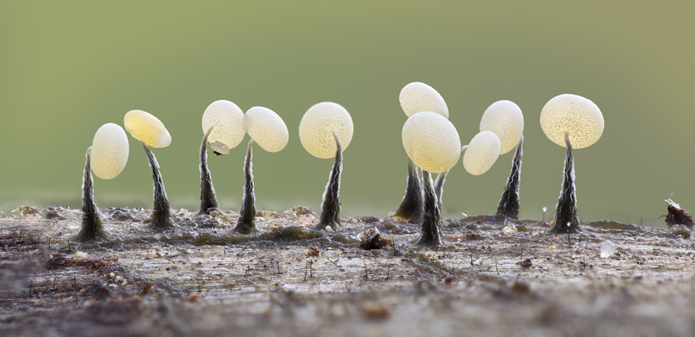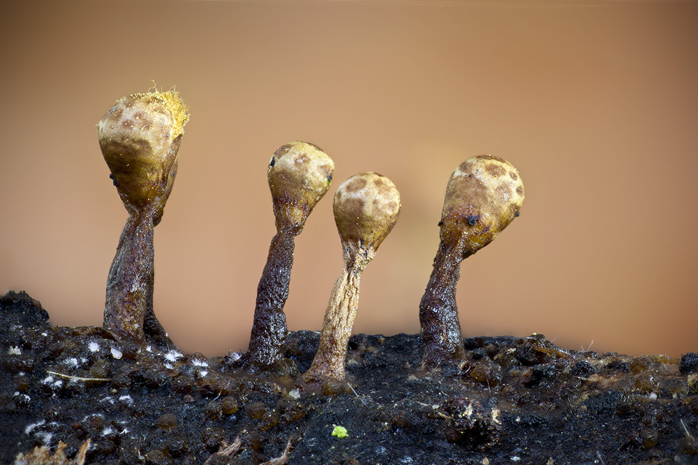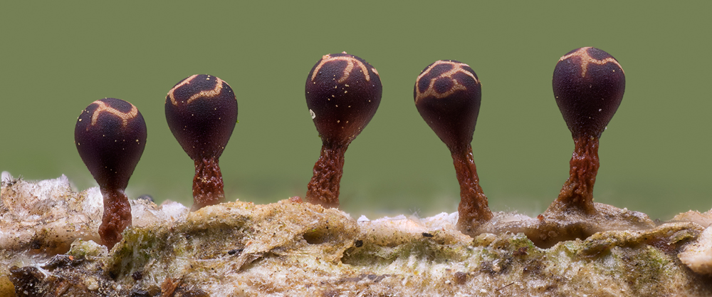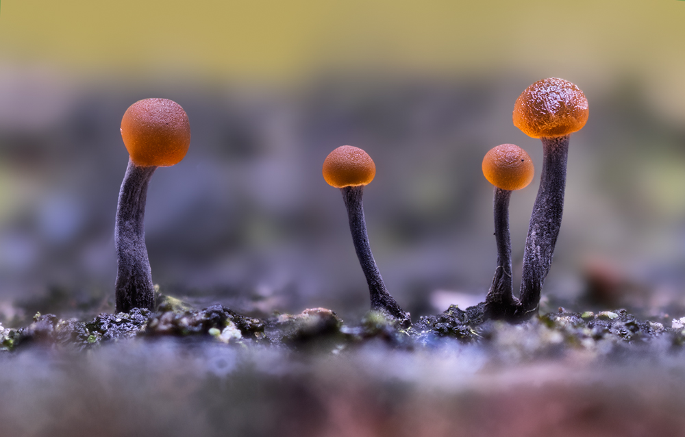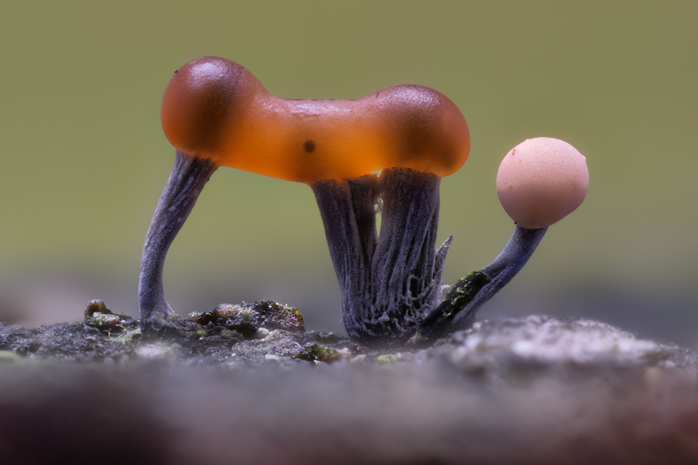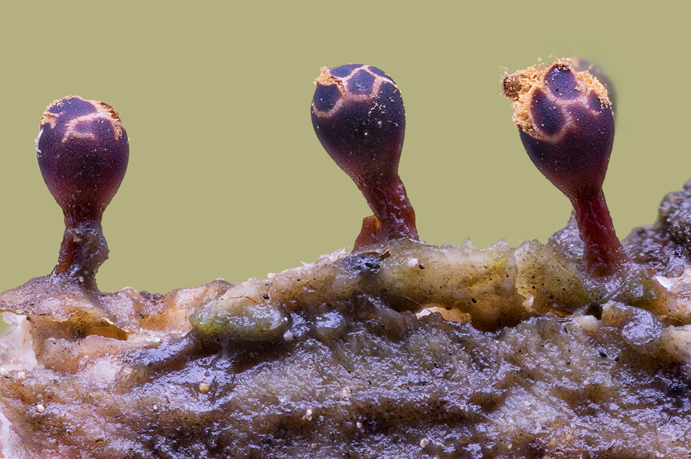 Leider war es unter diesen Umständen nicht möglich, eine schönere Freistellung der Pilze zu erzielen, was mir natürlich lieber gewesen wäre. Das untere Bilder wurden mit einem Abbildungsmaßstab von 4:1 aufgenommen, wodurch die abgebildete Bildbreite kleiner als 5 mm ist. Aus den Aufnahmen lässt sich eine ungefähre Hutgröße von 0,5 mm Durchmesser sowie eine maximale Höhe von etwa 1,2 mm ableiten.