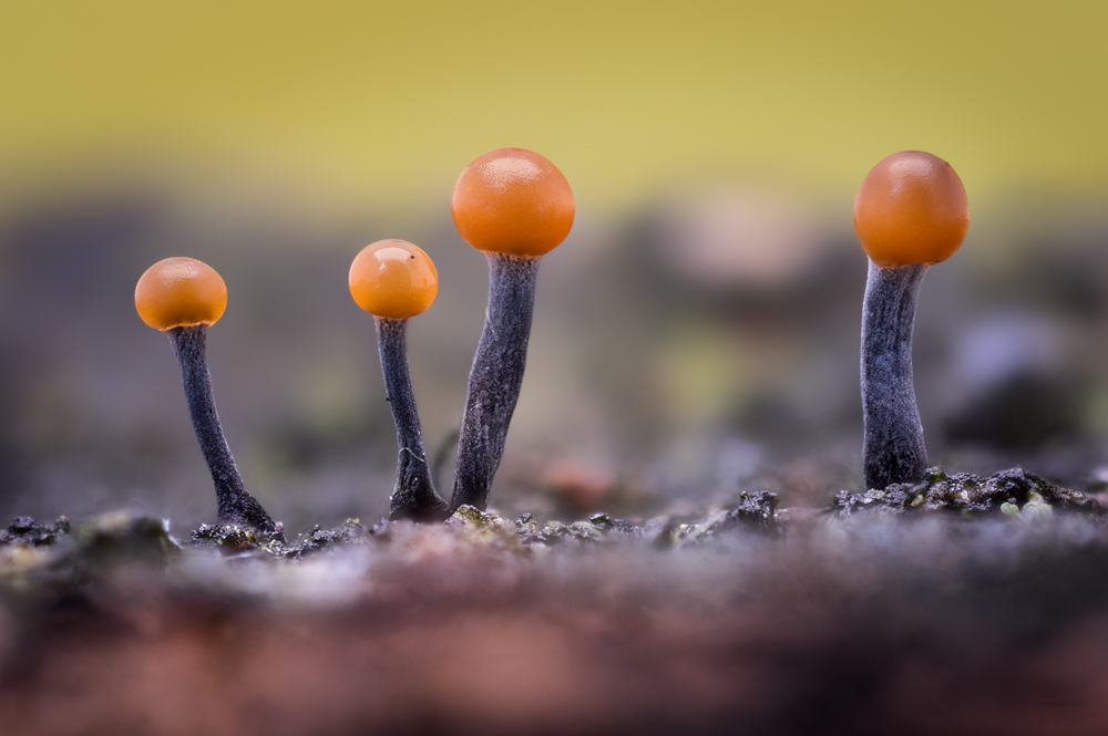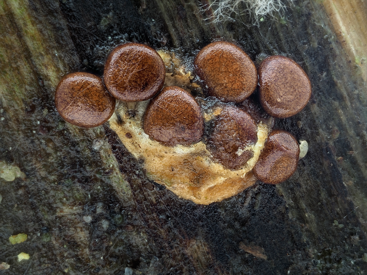 vor einigen Tagen bin ich bei der Suche nach Schleimpilzen auf diese kleinen, auffällig gelben Pilze gestoßen. Ich habe sie unter einem Baumstamm entdeckt – ihre leuchtende Farbe machte sie unübersehbar. Die Pilze wachsen auf einem undefinierbaren Substrat, das ich zunächst für eine Wurzel hielt. Zuerst vermutete ich, dass das umgebende Material Tierhaare sein könnten. Inzwischen bin ich jedoch ziemlich sicher, dass es sich dabei um Myzel handelt.