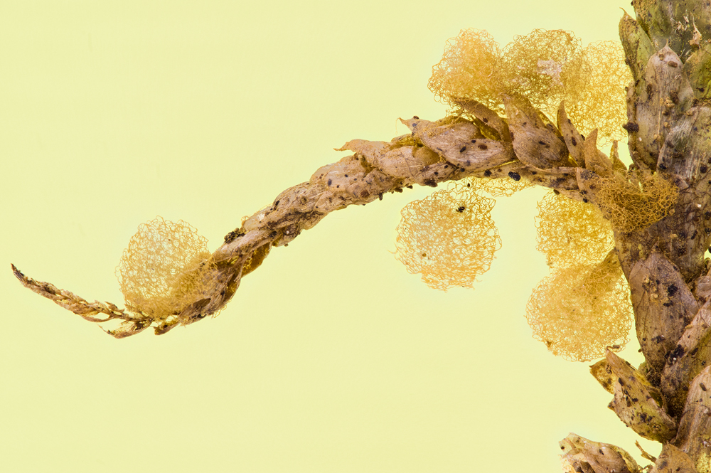 Auf einem dünnen Zweig habe ich diese Gebilde gefunden. Ich dachte erst, daß es sich um Schleimpilze handelt. Die Größe von ~ 3 mm