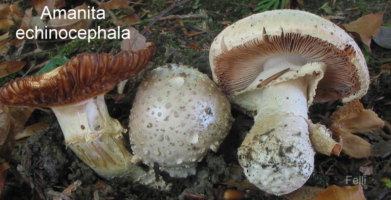 Hier aber sehe ich eine Amanita echinocephala, die im Alter, trotz grünlichem Sporenpulver rötliche Lamellen bekommt. Wenn man das Hutbild vergrößert, erkennt man auch die Spitzschuppigkeit.