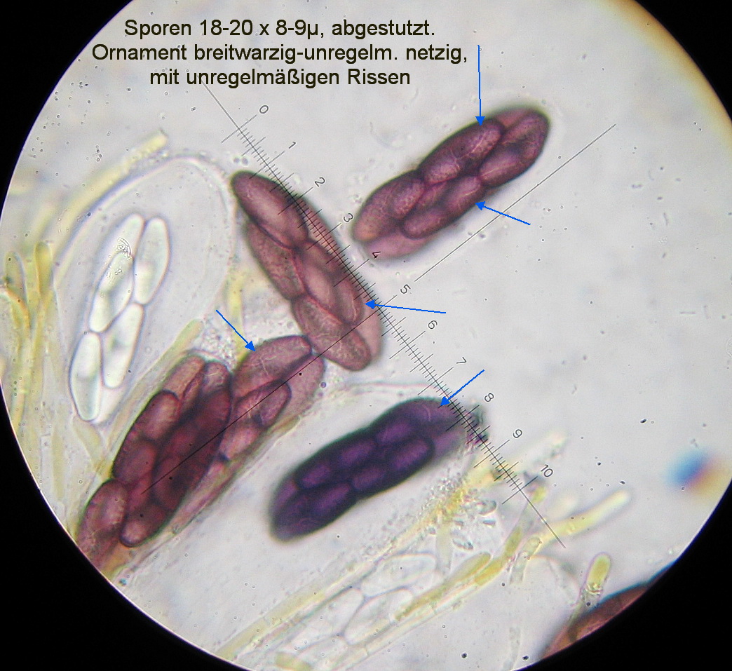 Nun würde T viridescens relativ gut übereinstimmen auch von der Ornamentation- nur sollte der auch 4-sporige , nicht verengte Asci haben