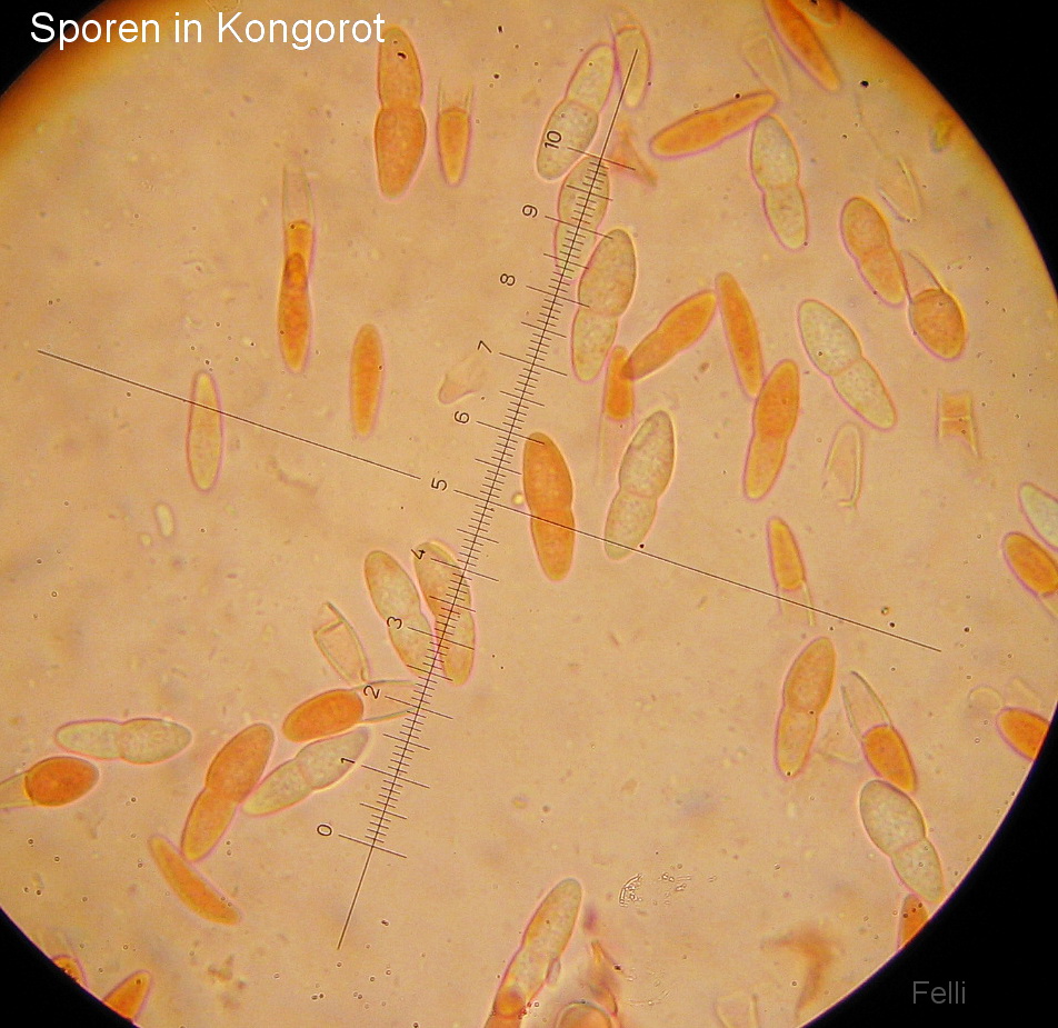Bei meinem Fund sind die Sporen in Form Größe und Guttulen identisch, nur haben die kein Ornament und die Apothecien wachsen direkt auf einem braunfaulem teils bemoosten Holzstammstück, und die Apothecien sind nur bis 2 cm groß graubraun bis gelbbraun.