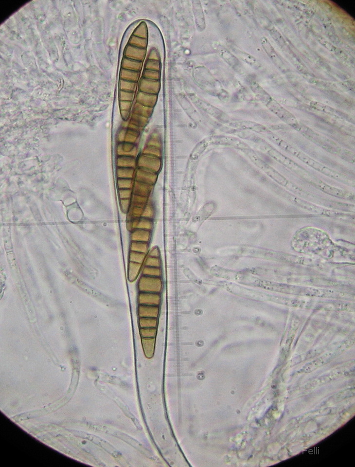 Sporen: 35-42 x7-8-9µ, gelb-braun, warzig punktiert, 4.Zelle verdickt, 7-9 x septiert an den Septen leicht verengt.