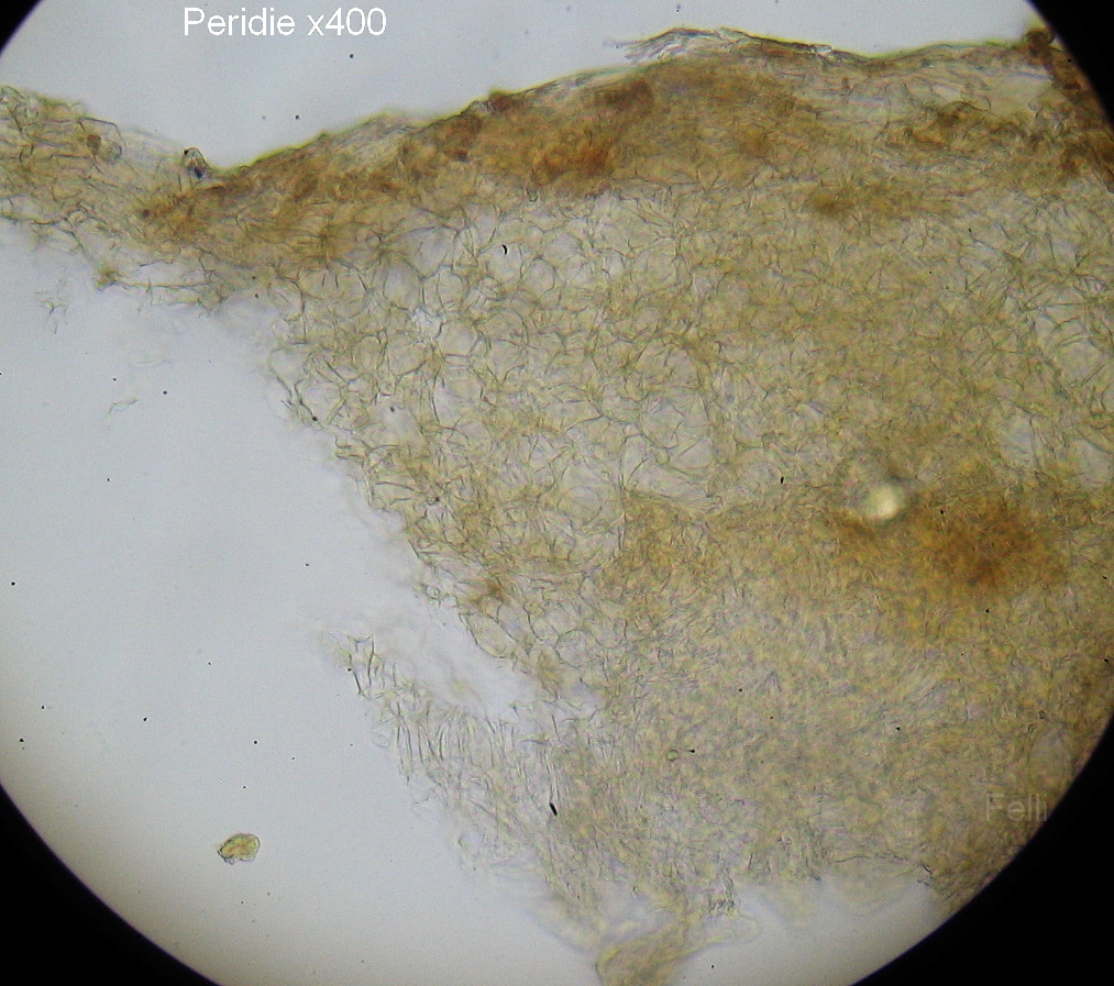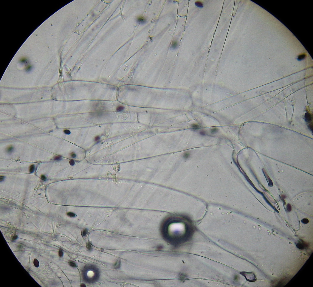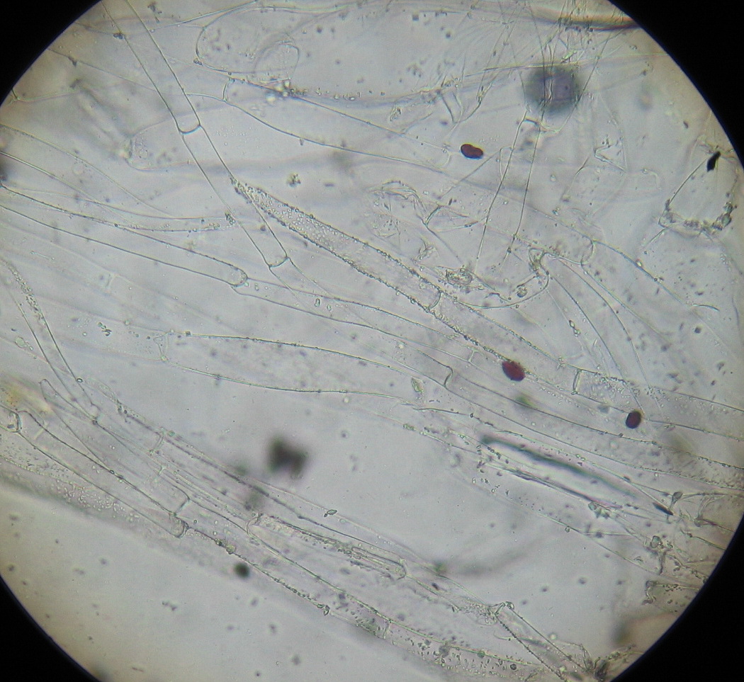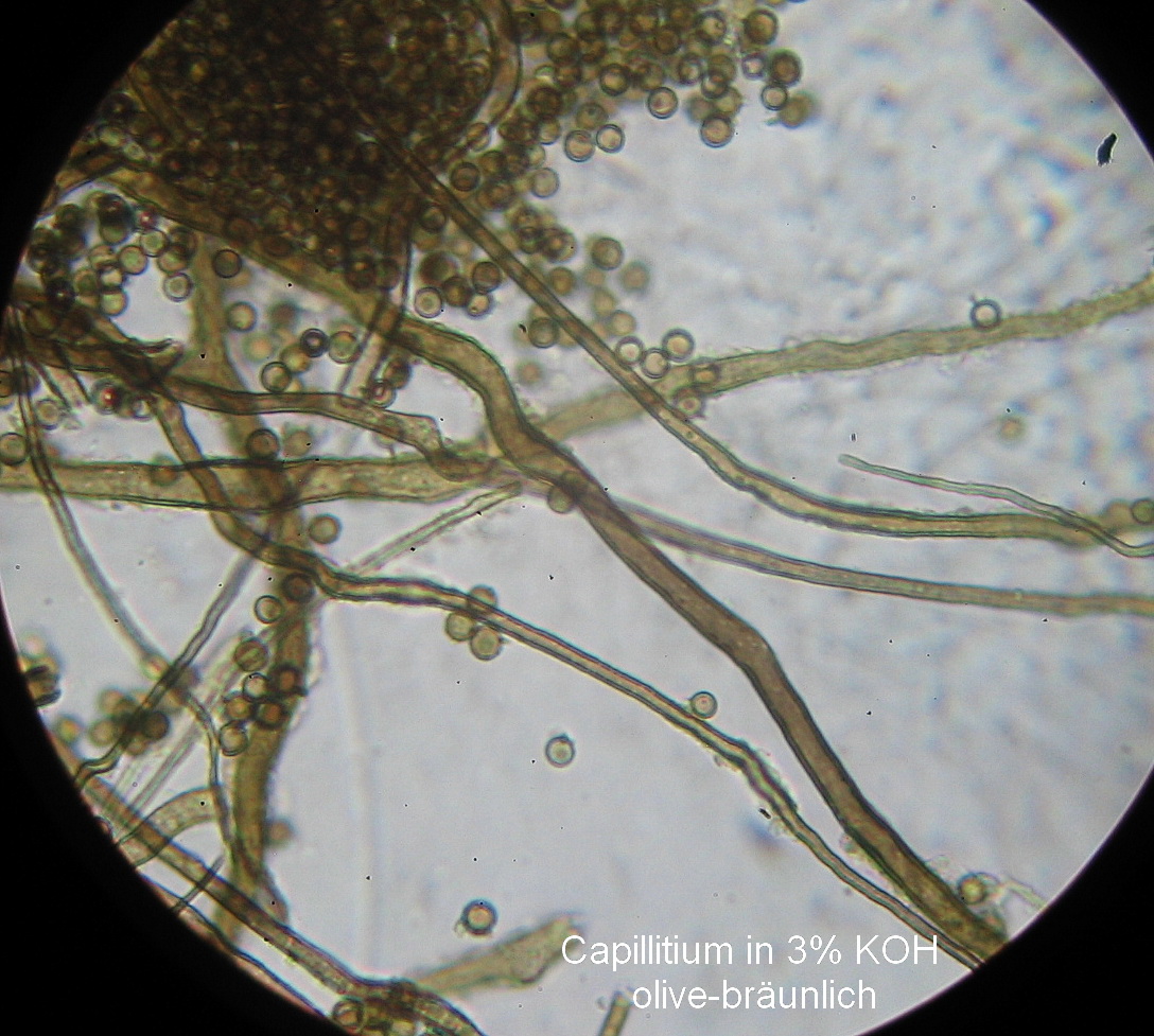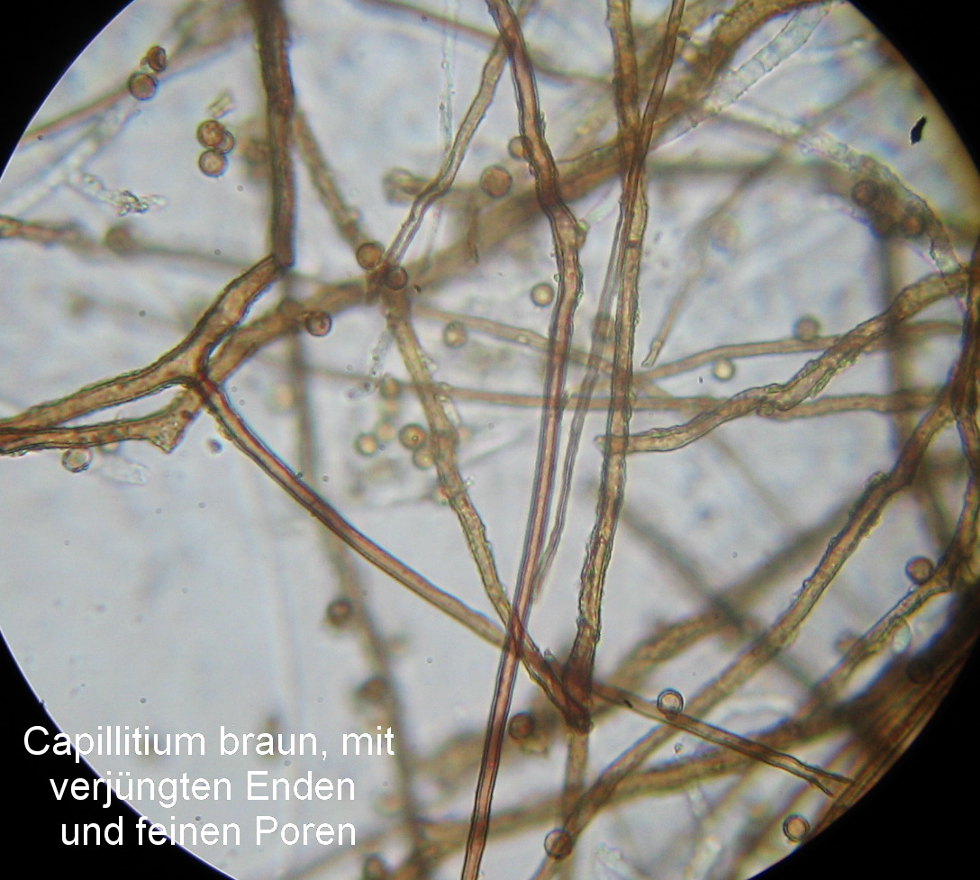 Das braune, teils inkrustrierte, wenig septiert Capillitium hatte meiner Meinung nach winzige Poren, war verzweigt, und verjüngte sich kontinuierlich zum Ende hin.