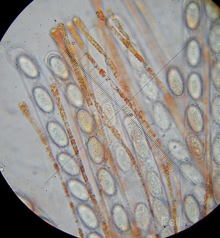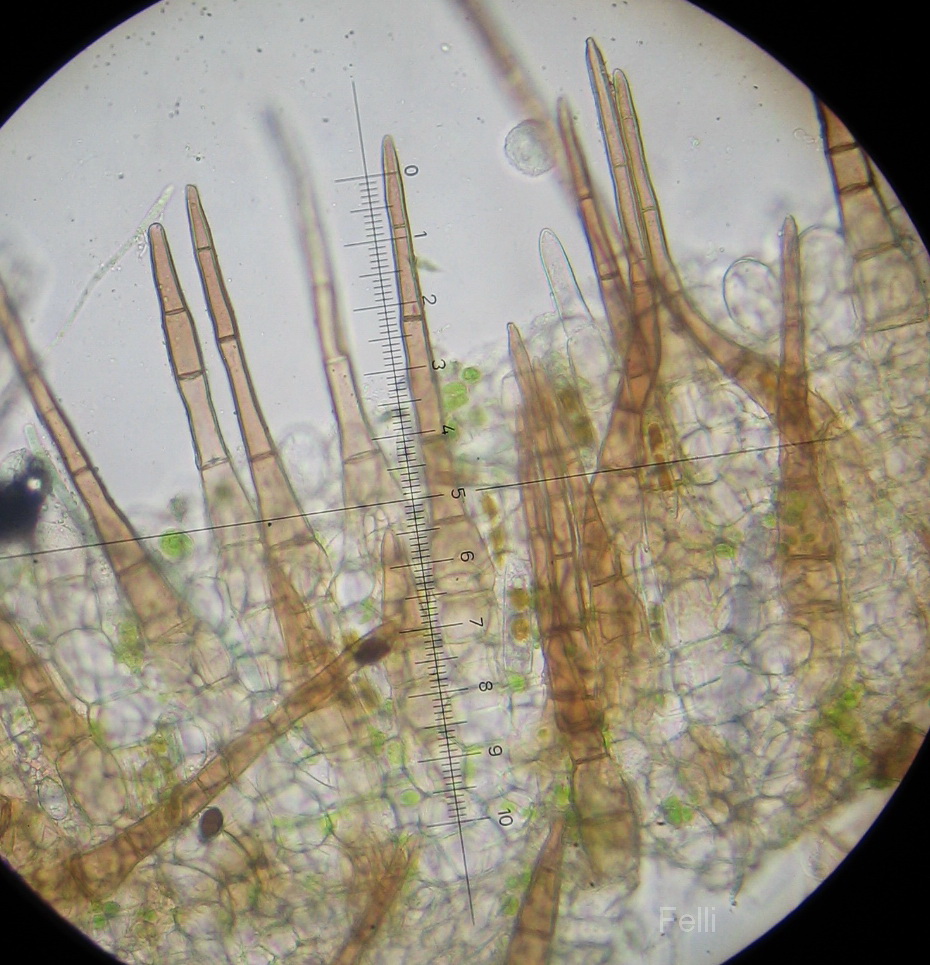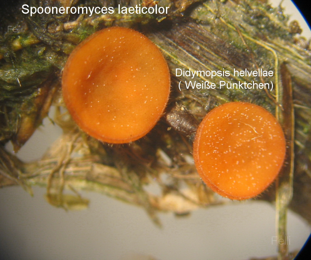 Auch die hyalinbraunen, dickwandigen, septierten Haare mit breiter, nicht wurzelnder Basis passen natürlich nicht für die Gattung Scutellinia sondern eben zu Spooneromyces laeticolor.