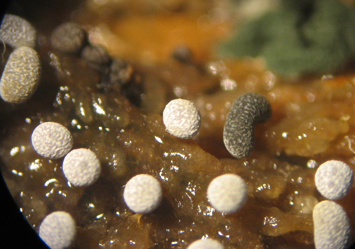 Andere Sporen sind zerknittert, mir fehlt grad das richtige Wort. Furchig? Keine Ahnung ob die reif sind oder einfach deformiert weil gammlig oder von einem Parasit befallen.