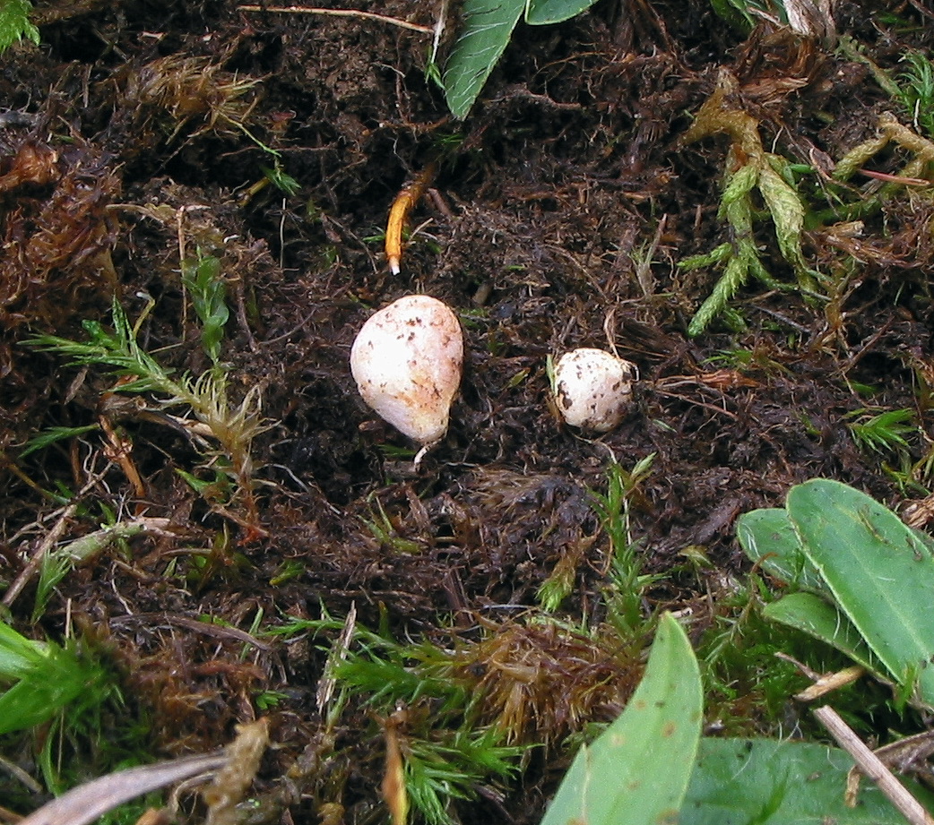 in einer dieser Scharrstellen lagen zwei weiß-filzige Knubbel, die nach Berührung sofort himbeerrot verfärbten.