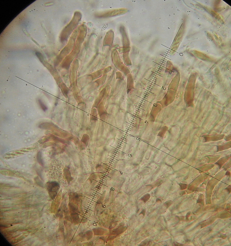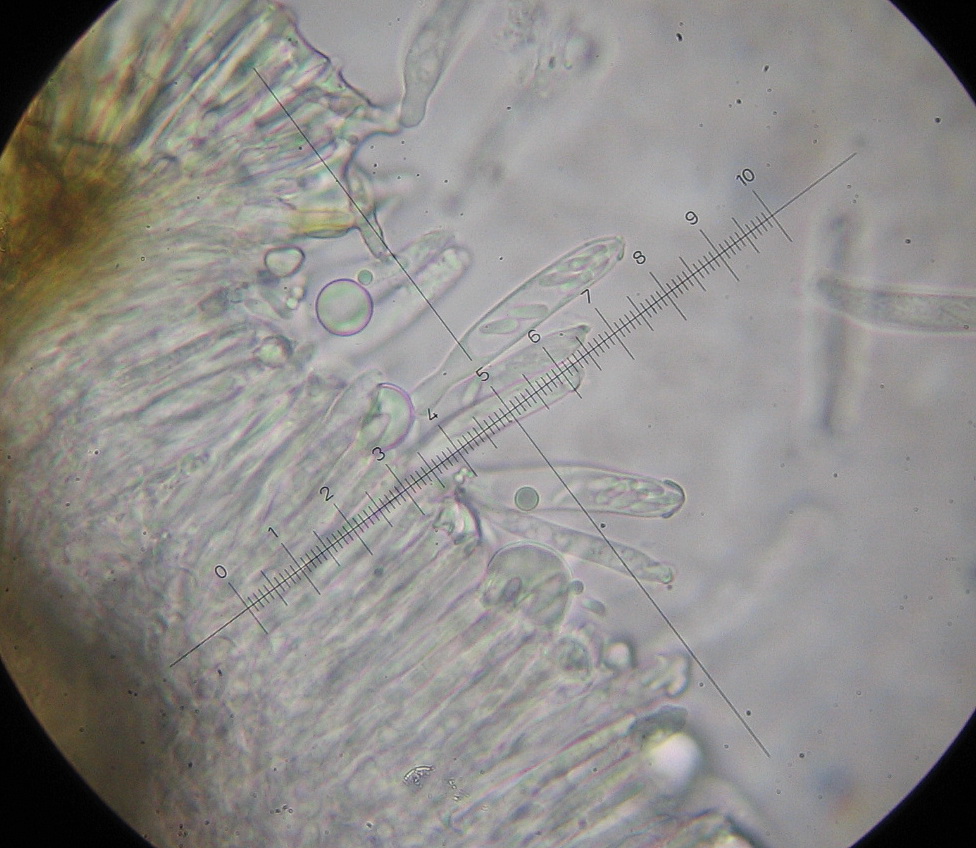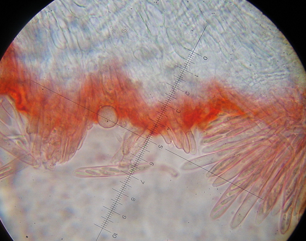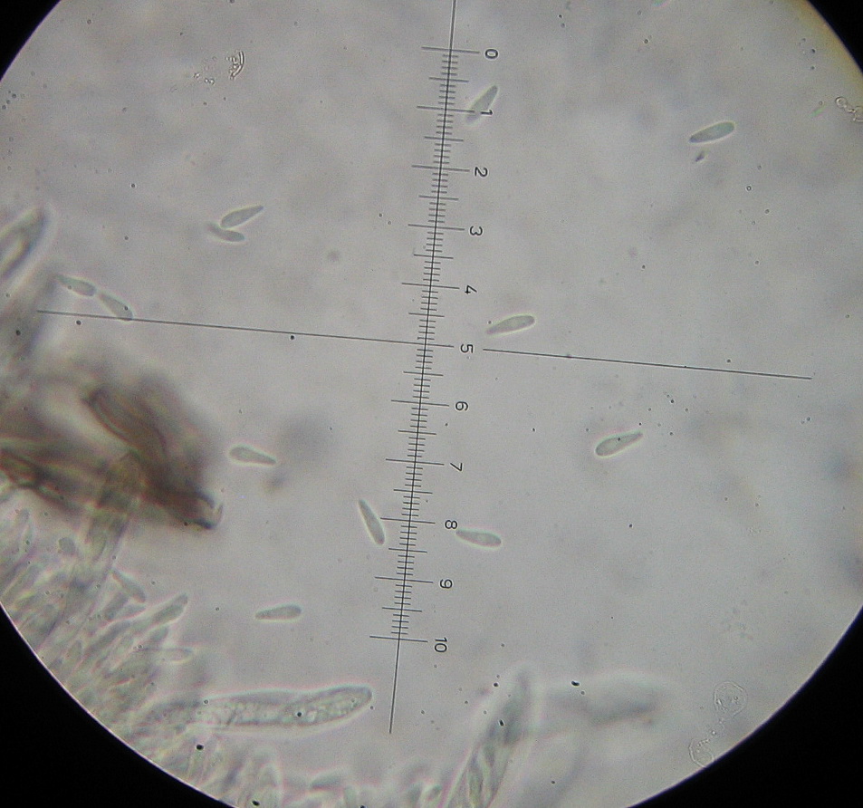Die Sporen bei Pachyella hätten aber normaler Weise 2 größere Guttulen - was hier nicht passt.
