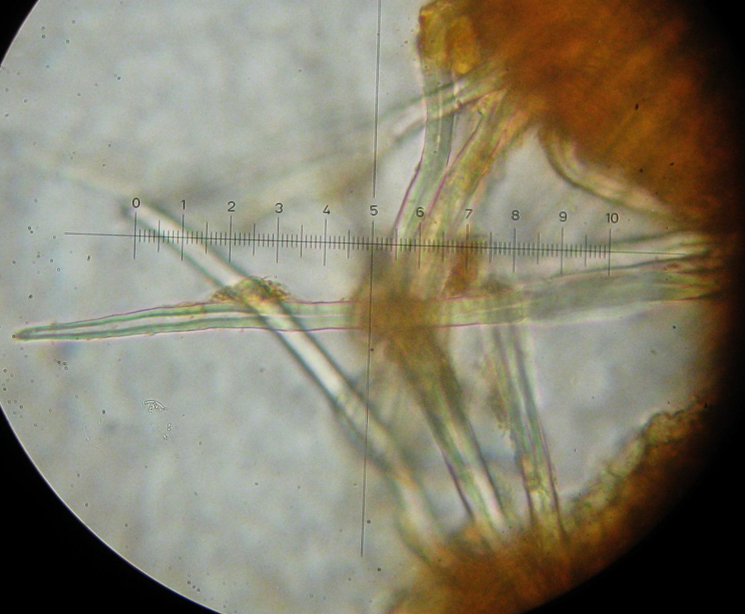 Am Rand befanden sich bis 150 x10-20µ große, zylindrisch-leicht keulige Haarbüschel