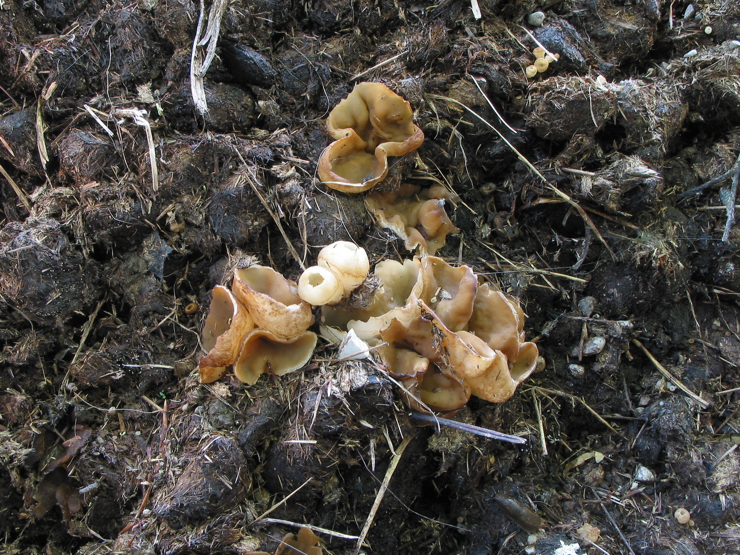 Ich sehe hier viel eher Peziza fimeti s.l. Das würde auch besser zum Wachstum direkt auf Pferdedung passen.