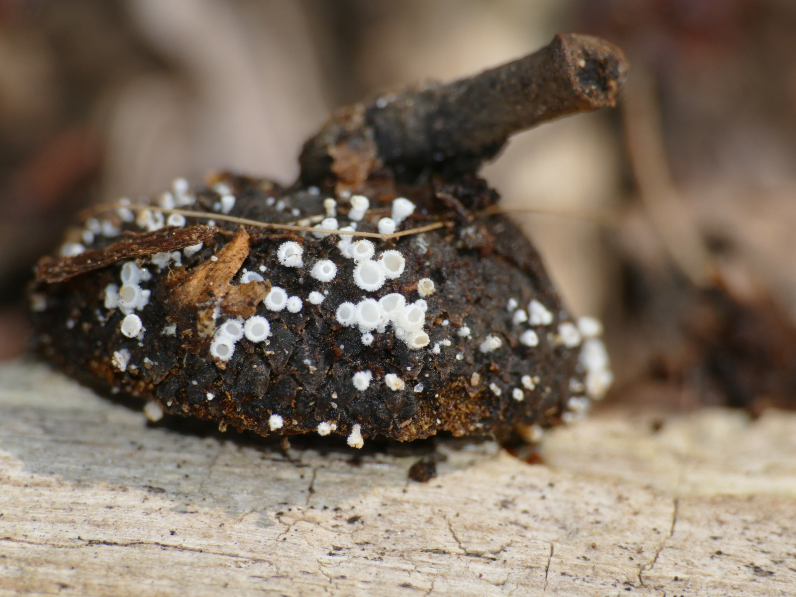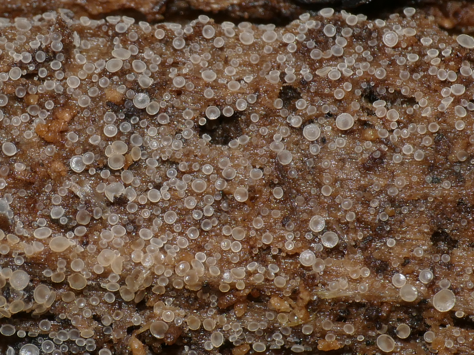 (3) Substrat: Laubholz (ich denke es war Eiche). Eine Wachskruste, Poren oder ähnliches kann ich hier nicht entdecken. Der Pilz war mir für die Bestimmung zu schwierig, leider nichts gefunden. Aber wenn man sich mal die Zeit nimmt, muss man zugeben, dass die im Makro wirklich hübsch anzuschauen sind und mich stark an Mineraliendrusen erinnern.