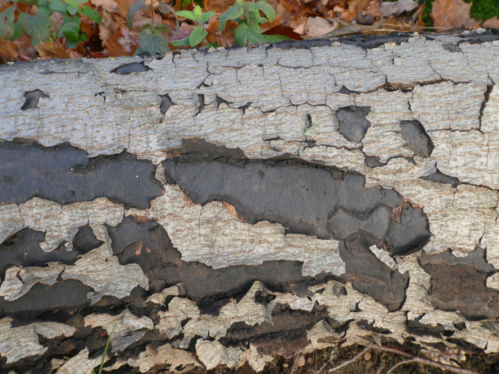 (1) Der Krustenpilz Kretzschmaria deusta auf einer Buche, der scheinbar eng mit den Holzkeulen verwandt ist.