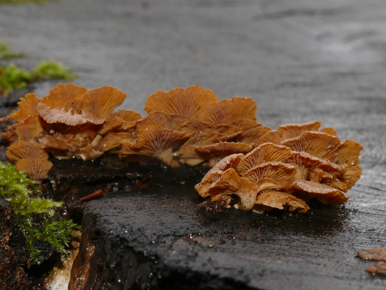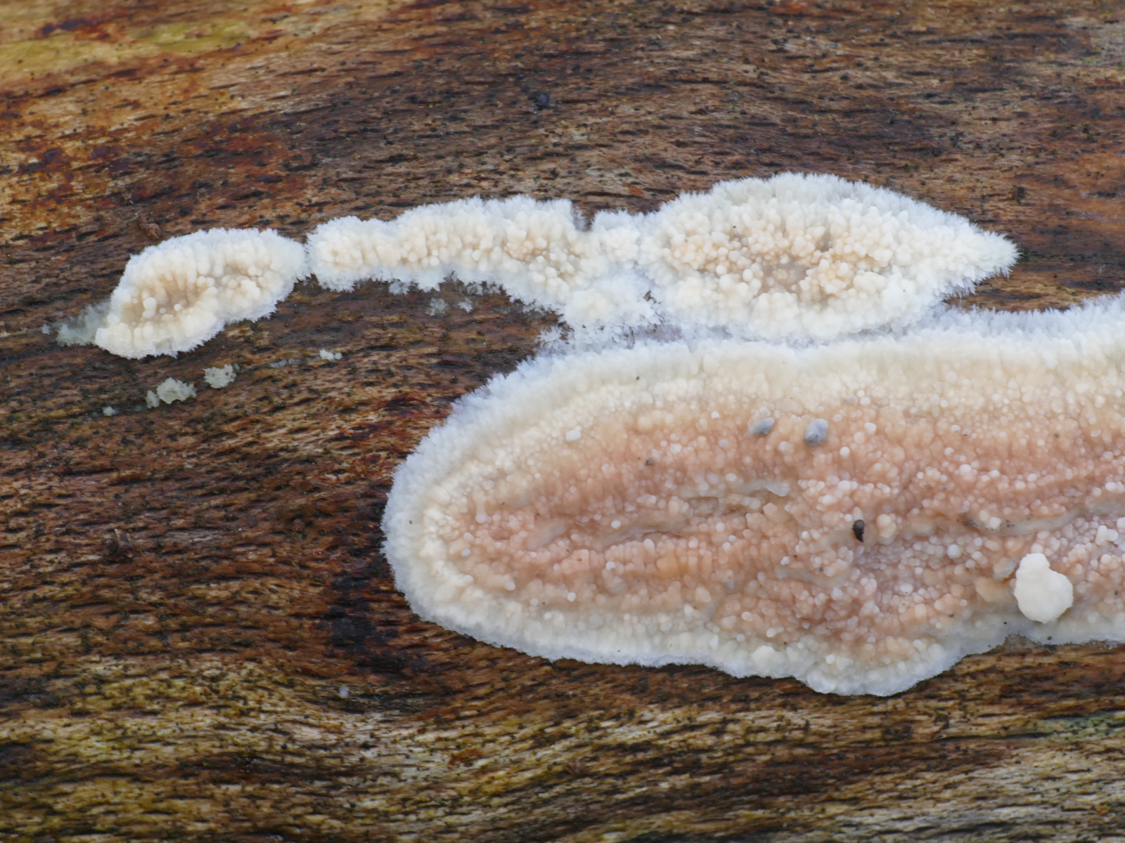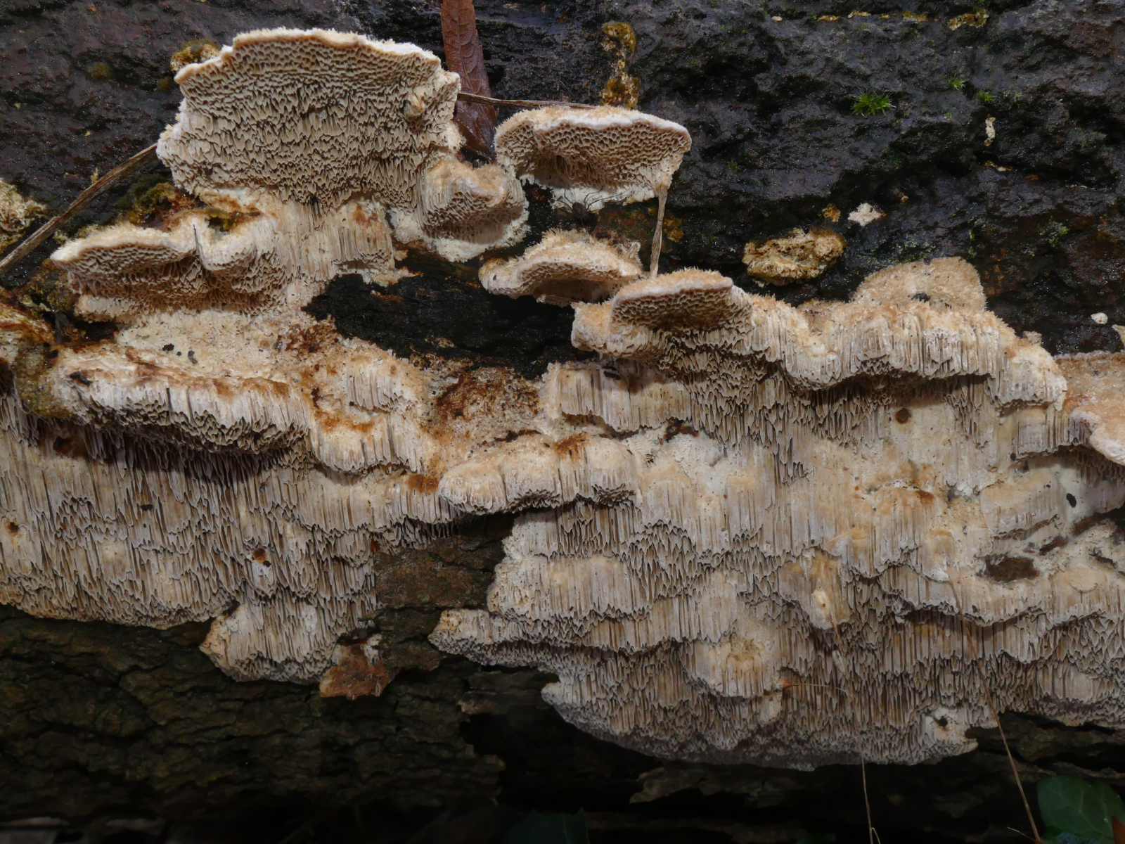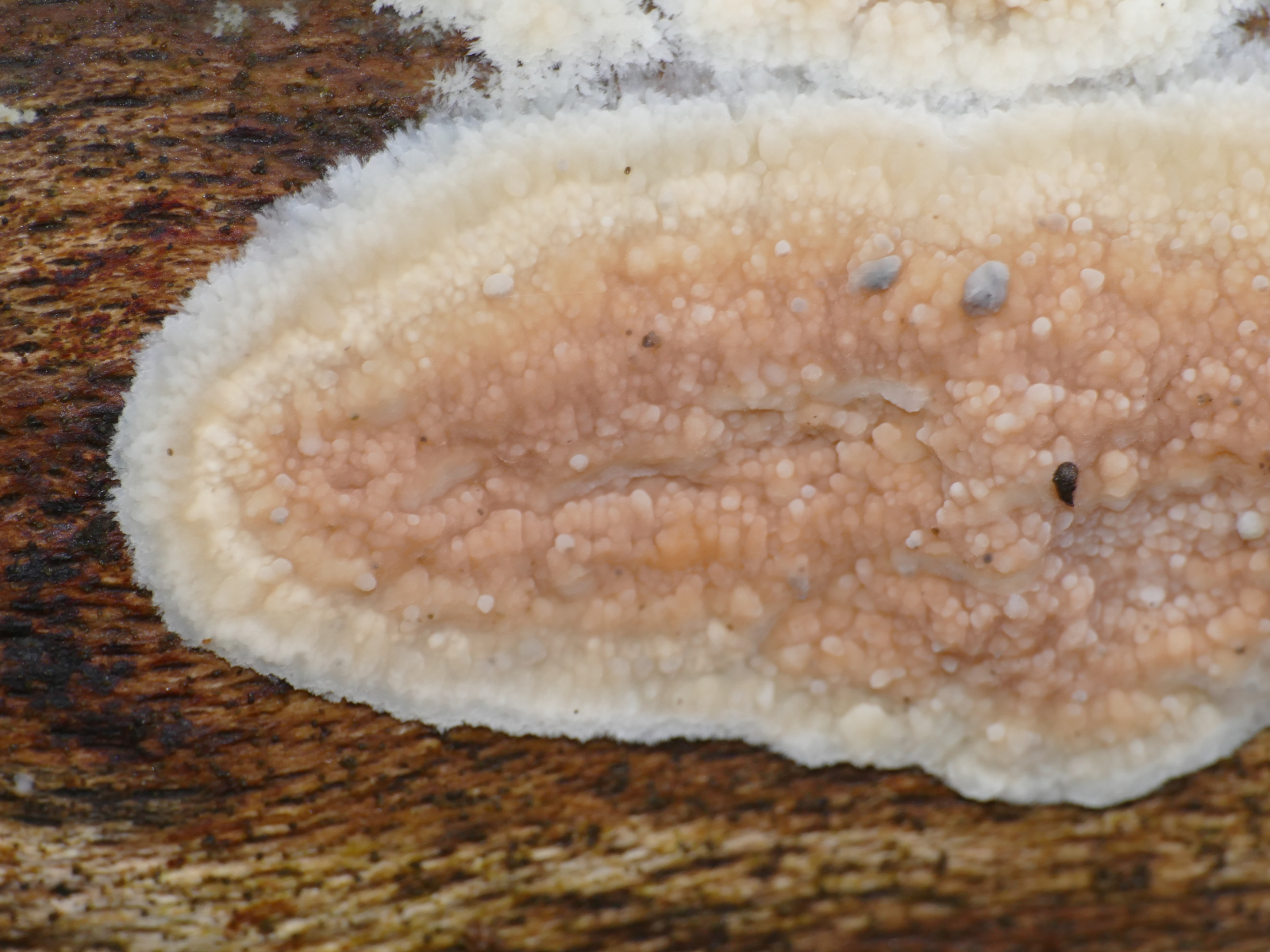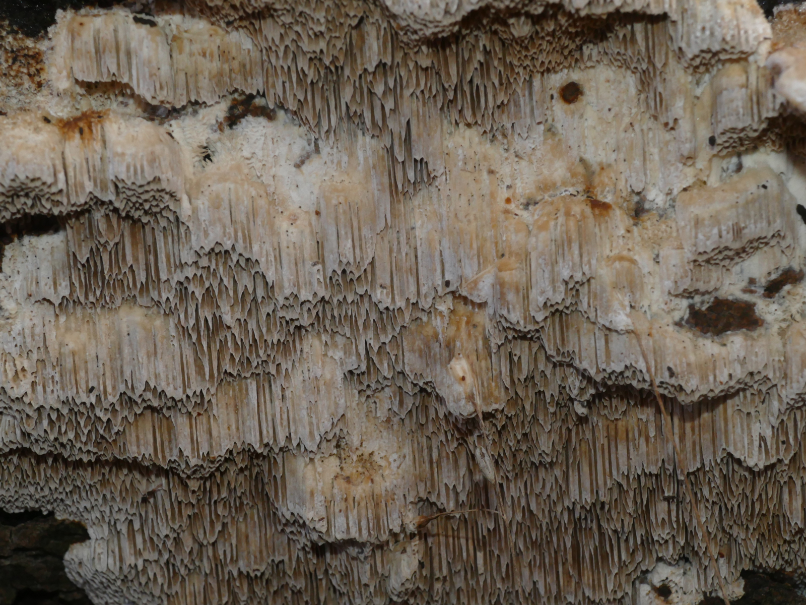 (4) Und der letzte: Hier habe ich bestimmt ein Mitglied der Poriales erwicht, einen Porenpilz. Jedenfalls sehe ich klar die wirklich langen Röhren. Die Oberseite ist stark flauschig und ich war oberseits etwas an Striegelige Trameten erinnert, aber ich vermute, dass es wohl doch etwas anderes sein wird, weil die Röhren schon echt lang und an den Enden scheinbar schräg angeschnitten sind.