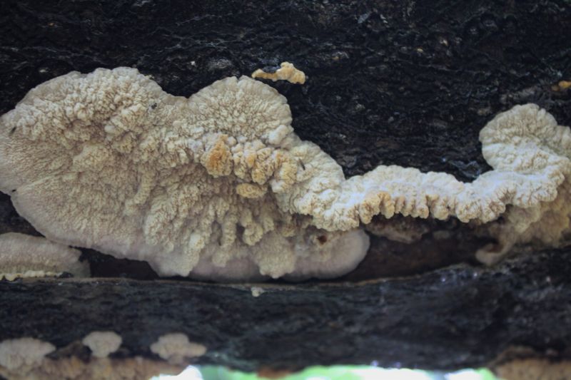 Diesen Pilz fand ich an einem hängenden Carpinus-Stamm in einem Auwald. Von der Form her erinnert er mich leicht (aber nur leicht) an Phlebia radiata, die hat aber eine ganz andere Farbe.