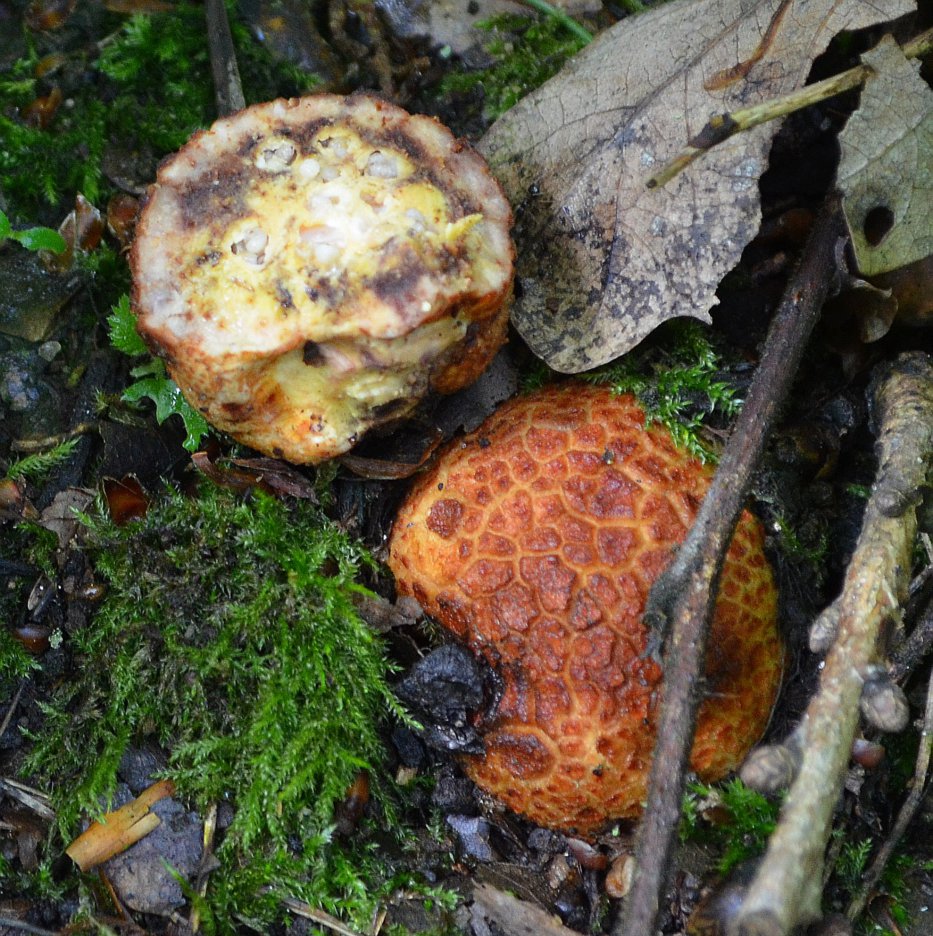 2 Sehr Feste kleine Kugeln 4-5 cm im Durchmesser. Der aufgeschnittene war Innen madig, aber nicht die normalen Pilzmaden, sondern größere Larven. wuchs Teils unterirdisch an einer Buche. ist das eine Art Trüffel?