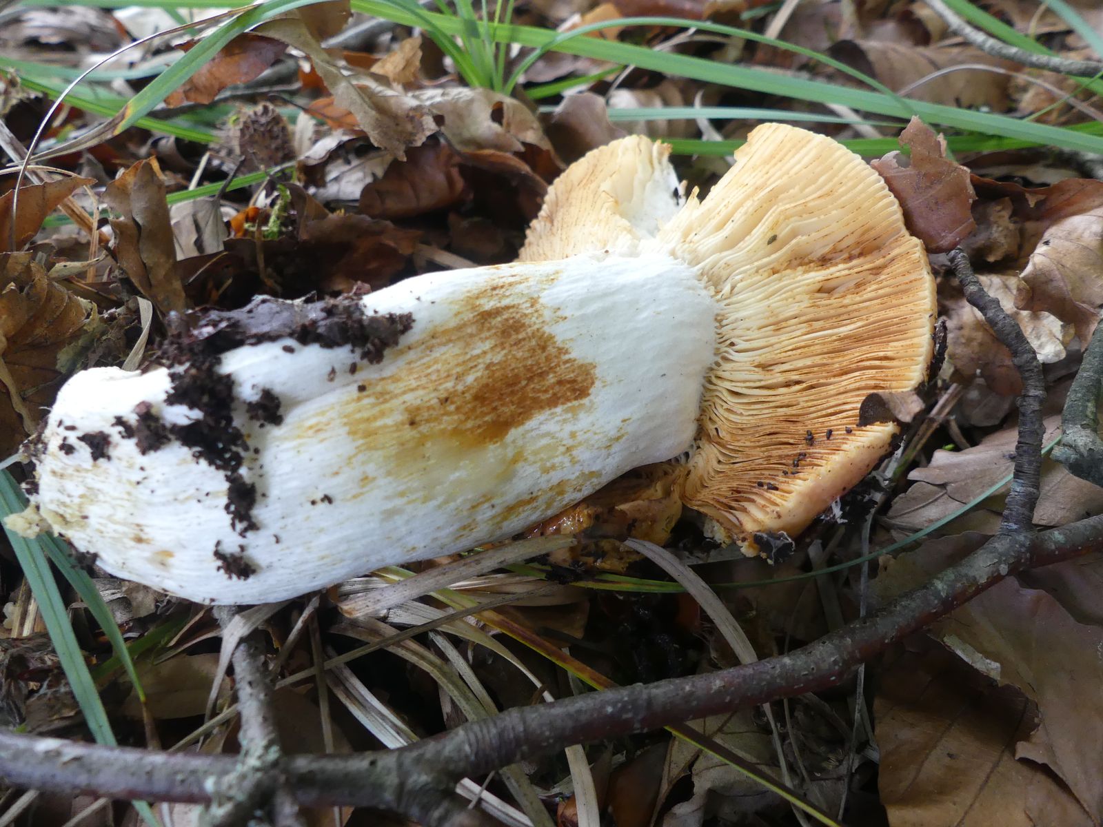 Tja, und dann die Nummer 7 .... Da wuchsen auch sehr ähnlich aussehende Täublinge. Die waren brüchig, also die Lamellen. Die gezeigten waren dagegen allesamt eben nicht brüchig, auch dann nicht, wenn man etwas mehr Druck ausübte. Ich hatte es gestern bei dem Exemplar welches ich mitgenommen hatte noch einmal probiert - da brach bzw. splitterte rein gar nichts. Können dies dann trotzdem Täublinge sein? Ich kenne mich mit Täublingen halt leider überhaupt nicht aus.