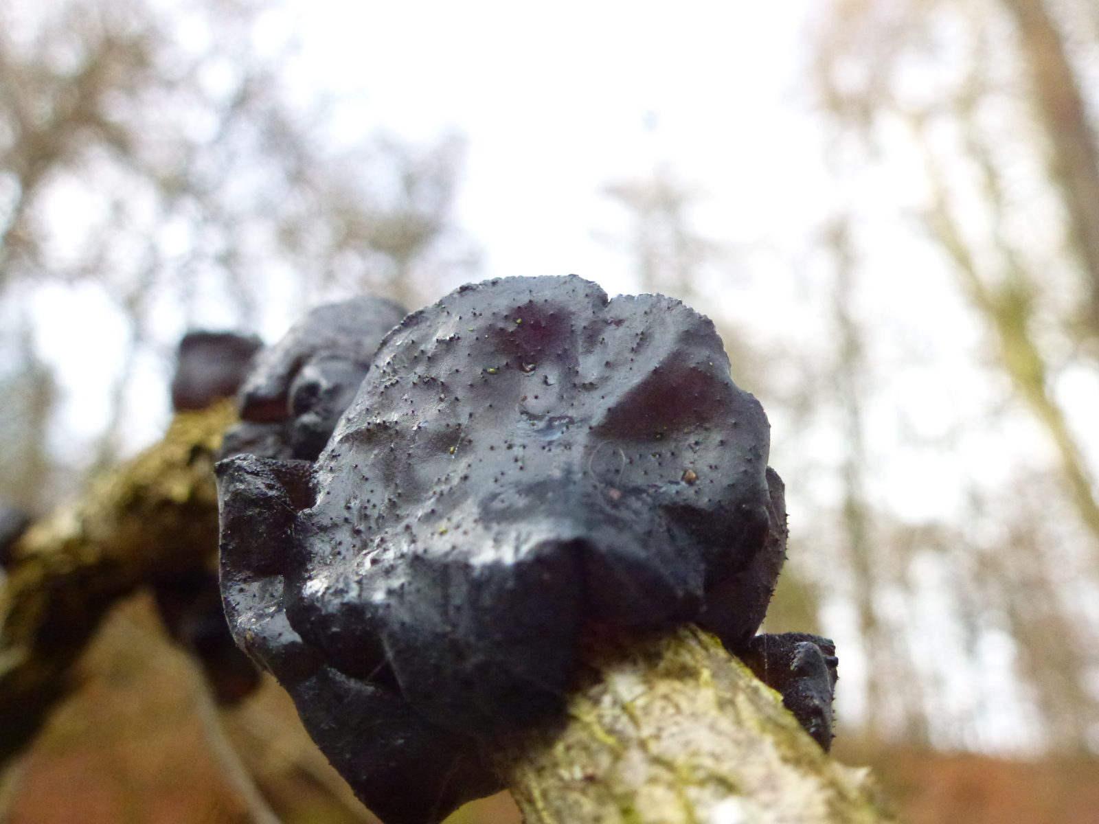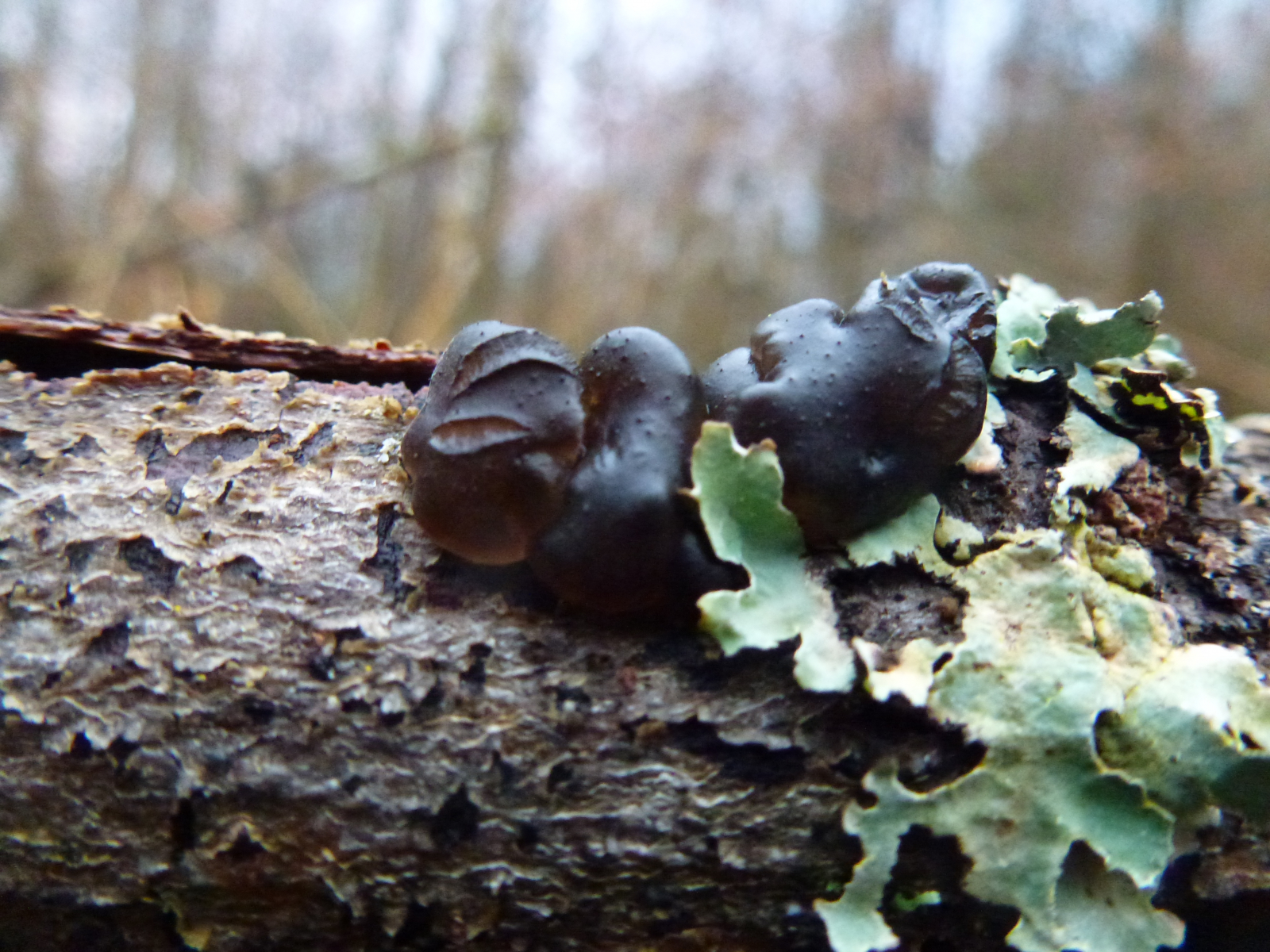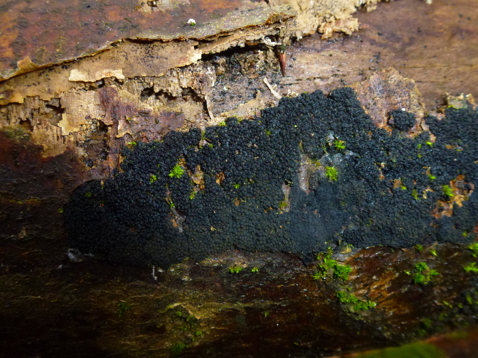 An einem am Boden liegenden Laubbaum (vielleicht Buche) waren diese Pilze wie eine sehr dünne Matte entlang des Stammes. Die einzelnen Kugeln waren sehr klein, vielleicht 1 bis 2 mm. Auch erschienen sie mir nicht so klar einzeln stehend und abgegrenzt, aber hier kann ich mich aufgrund der Winzigkeit natürlich täuschen. Auf dem zweiten Foto sieht man auch "Kugeln" in normaler Größe und wie ich sie sehr häufig sehe.