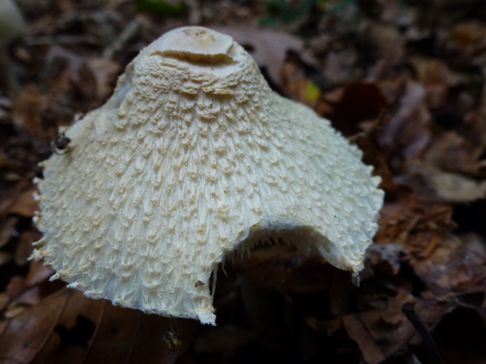 Der dünnfleischige Hut ist 4–“8 cm breit, jung halbkugelig, später glockig bis flach ausgebreitet und stumpf gebuckelt. Die Oberfläche ist weißlich-cremefarben und mit kleinen, blass bräunlichen bis ockerfarbenen, wolligen Schüppchen bedeckt. .Die klar abgegrenzte Mitte ist blass bräunlich und samtig-glatt. Der Rand ist bei jungen Fruchtkörpern mit weißen Velumresten behangen." Und dann sah ich die Fotos mit wirklich klar abgegrenzten Mitten! Die Pilze die ich fand hatten dies ja eigentlich nicht so ...