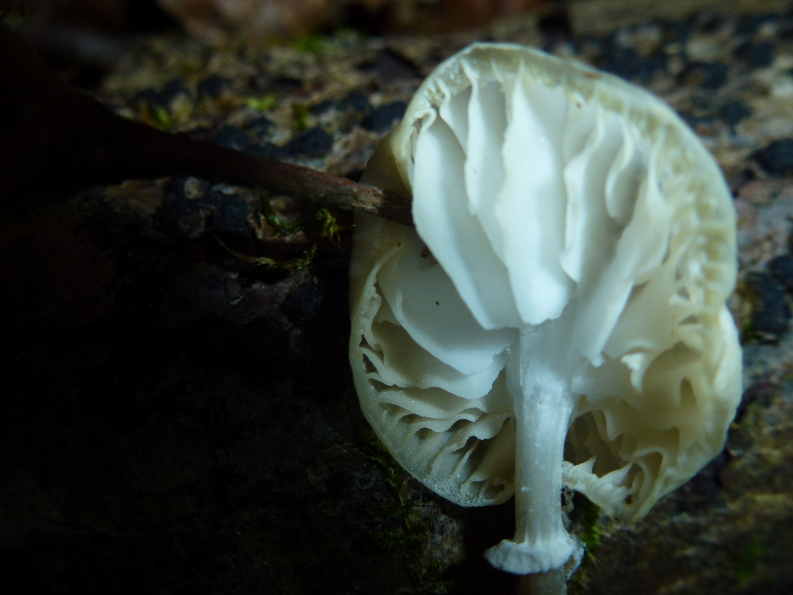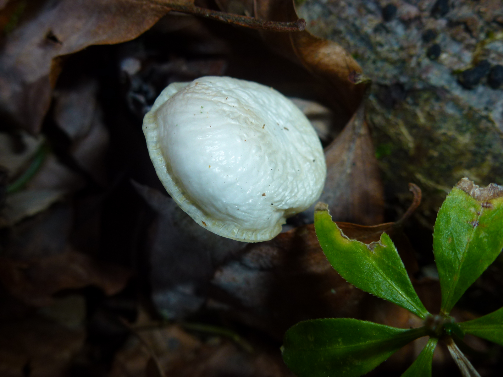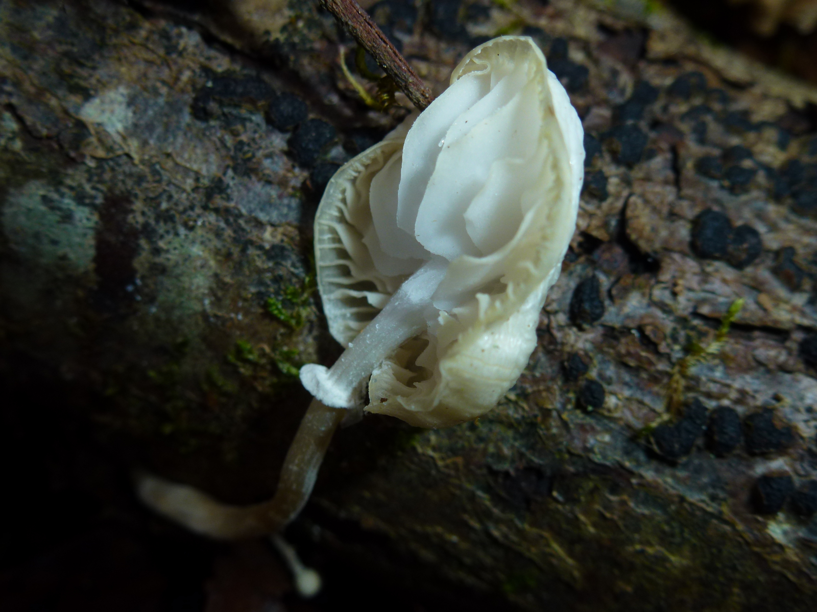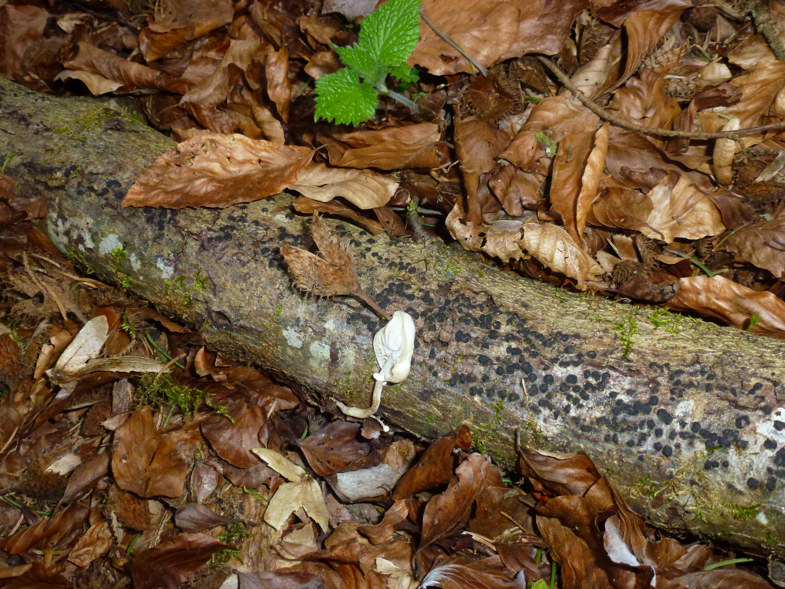 obwohl es sich hier um den Buchen-Schleimrübling handelt und man drumherum hauptsächlich Buchenblätter und -cupulen erkennt, scheint das Substrat hier ausnahmsweise Eiche zu sein. Das mache ich zum einen an der Rinde, aber auch an dem Pyrenomyceten fest. Da scheint es sich nicht um Diatrype disciformis, sondern um Diatrypella quercina zu handeln (der in diesem Fall schönere Pilz :P). Man sieht außerdem noch ein paar Blätter der Hainbuche und Fichtennadeln. An letzteren befindet sich offenbar noch ein Lophodermium oder so.