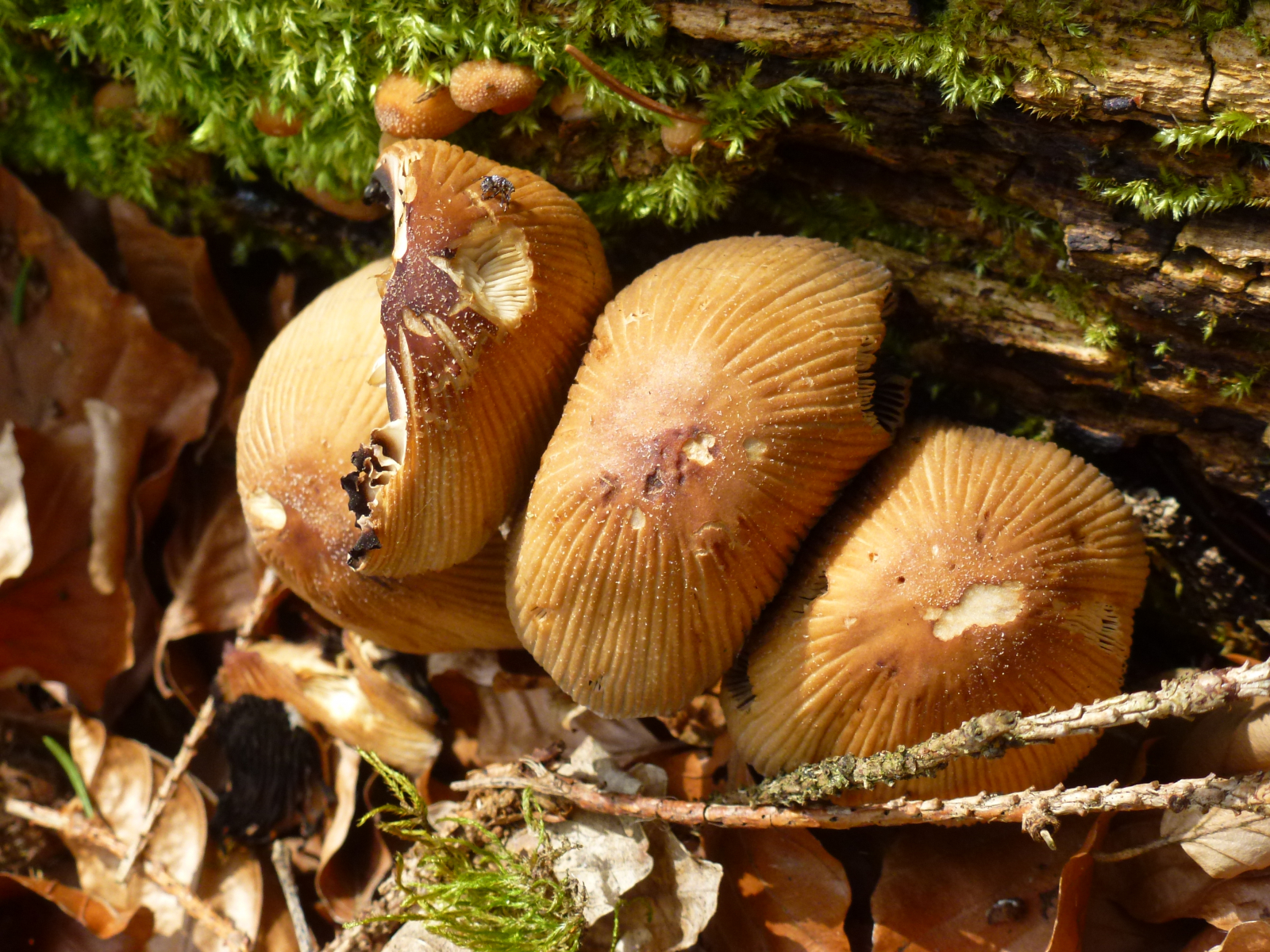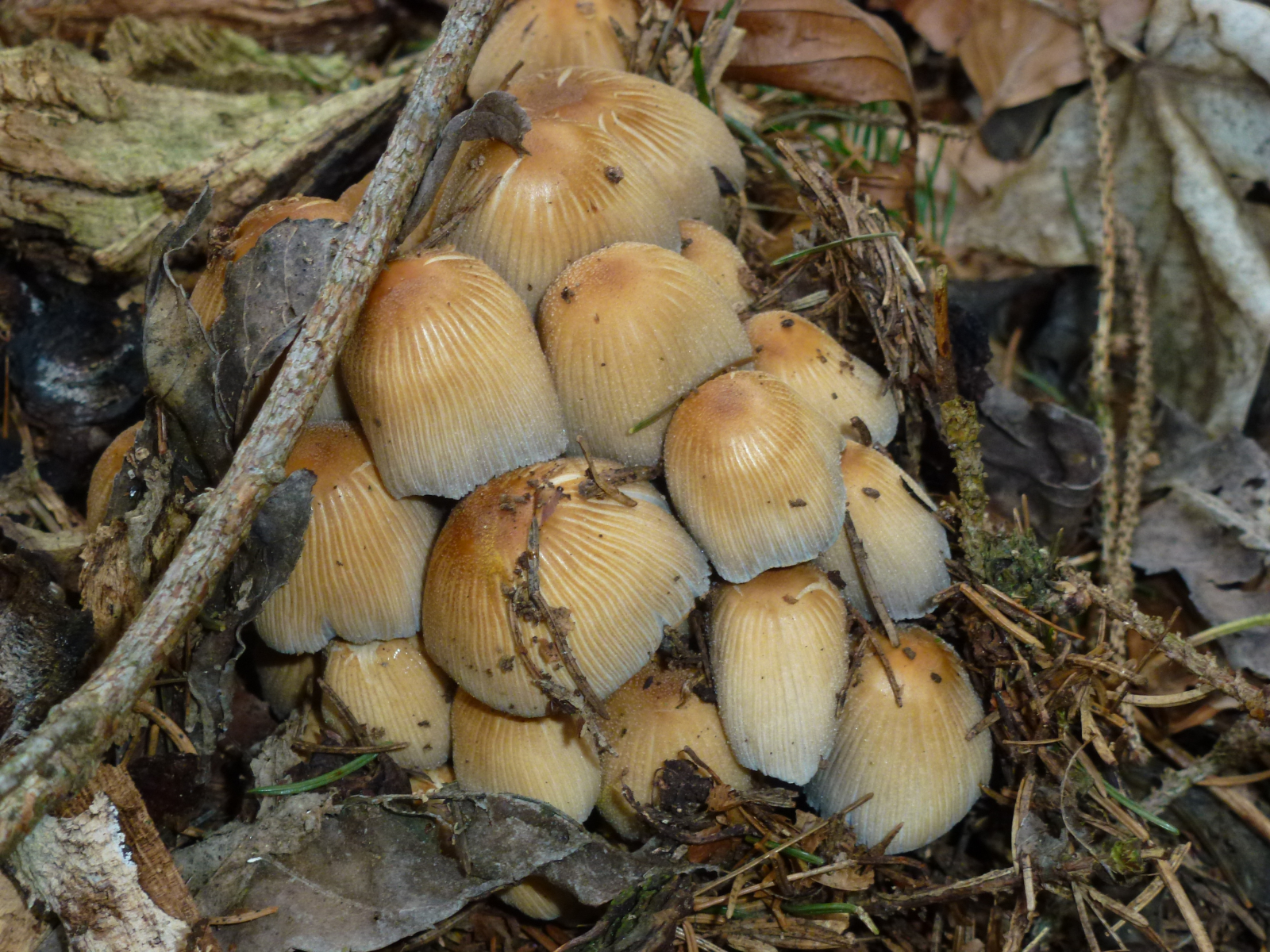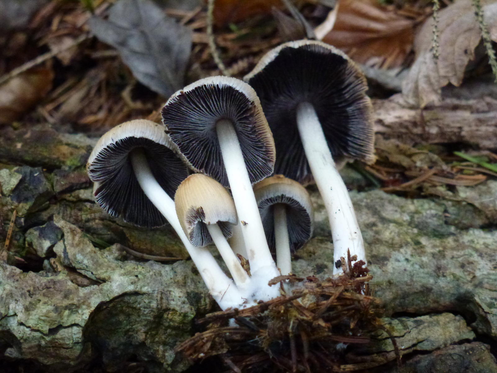 Beim Glimmertintling war ich bei meiner Suche auch, aber da las ich, das die Hüte jung glockenförmig seien, so wie hier denke ich, und die Lamellen jung weißlich wären, im Alter grau bis schwarz. Die Hüte der älteren Glimmer-Tintlinge sahen dann auf den Fotos wieder ganz anders aus als die Pilze auf meinen Fotos ...