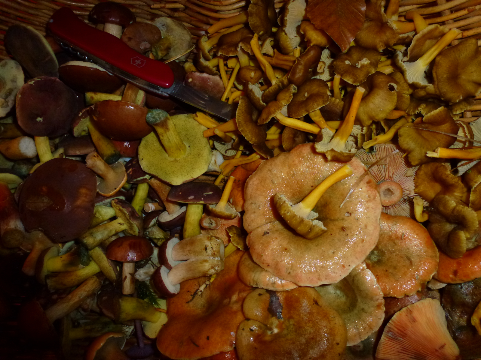 Im Korb sind Trompetenpfifferlinge, Fichtenreizker, Edelreizker, Maronen, Filzröhrlinge (welche genau kann ich nicht sagen), Rotfußröhrlinge, Kuhröhrlinge, Butterpilze, Sandpilze und Amethystblaue Lacktrichterlinge, nachfolgend ein Foto davon.
