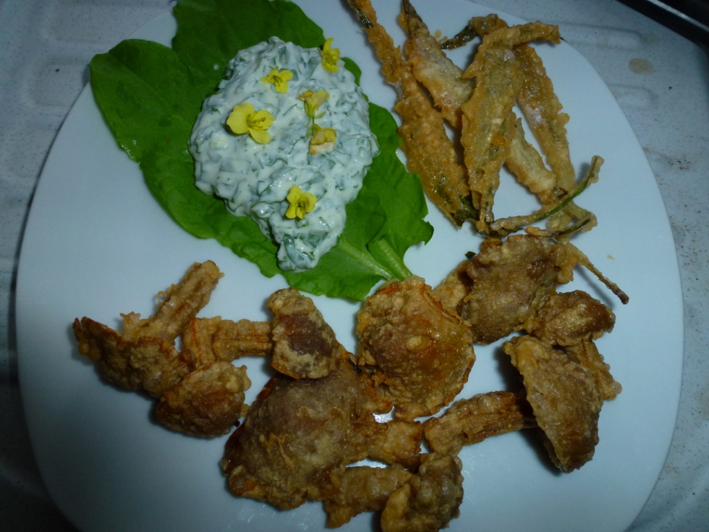 Frittierte Reifpilze mit frittiertem Spitzwegerich und Sauerampfer-Mayonnaise