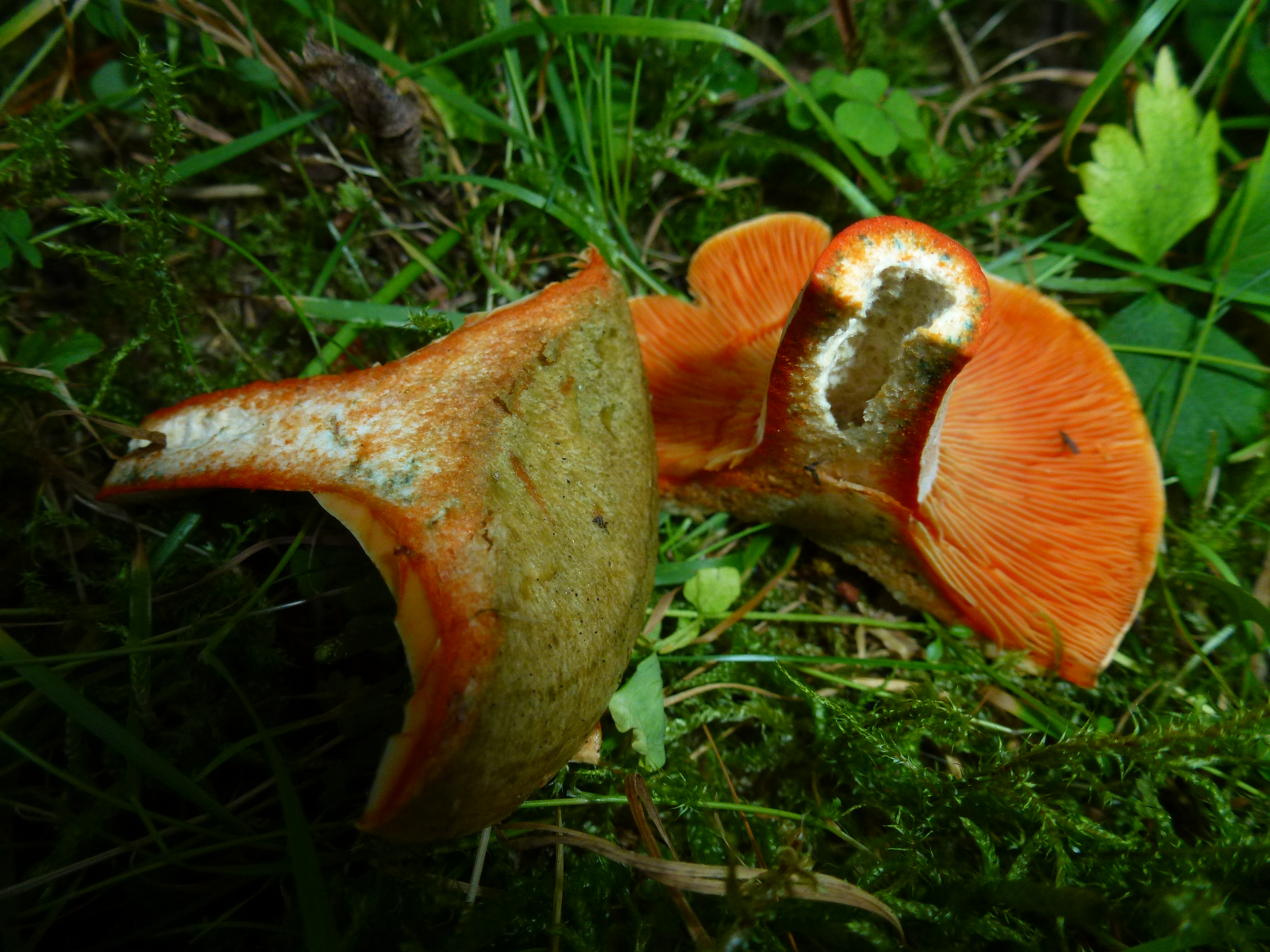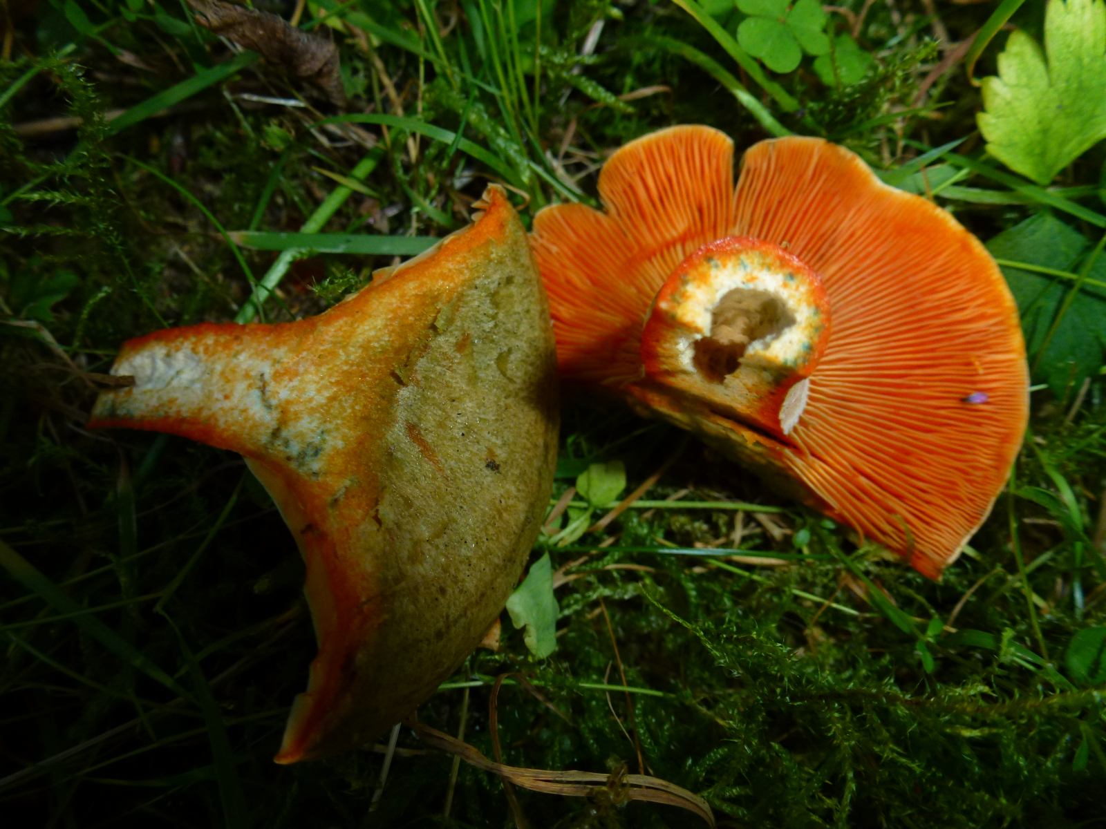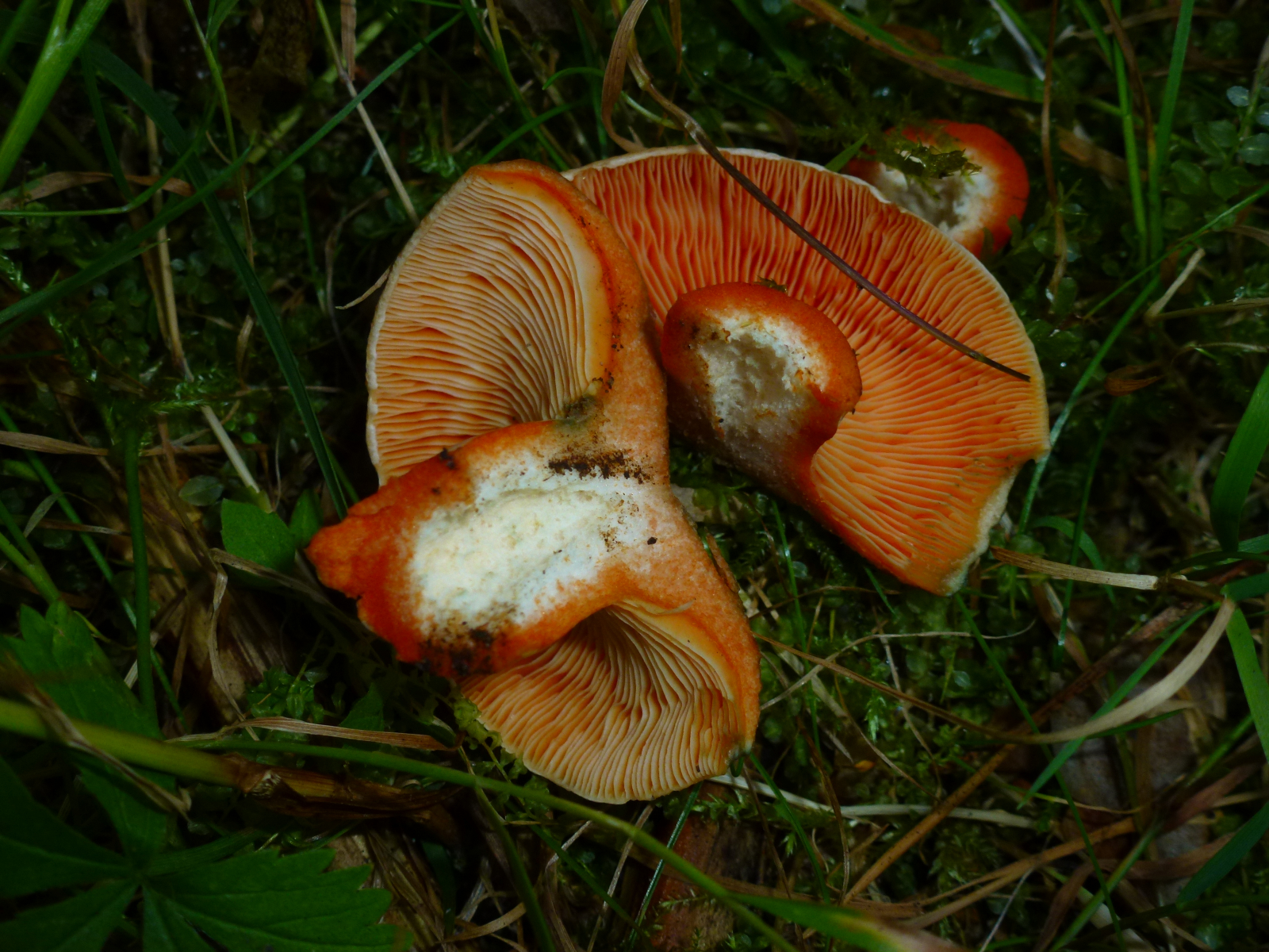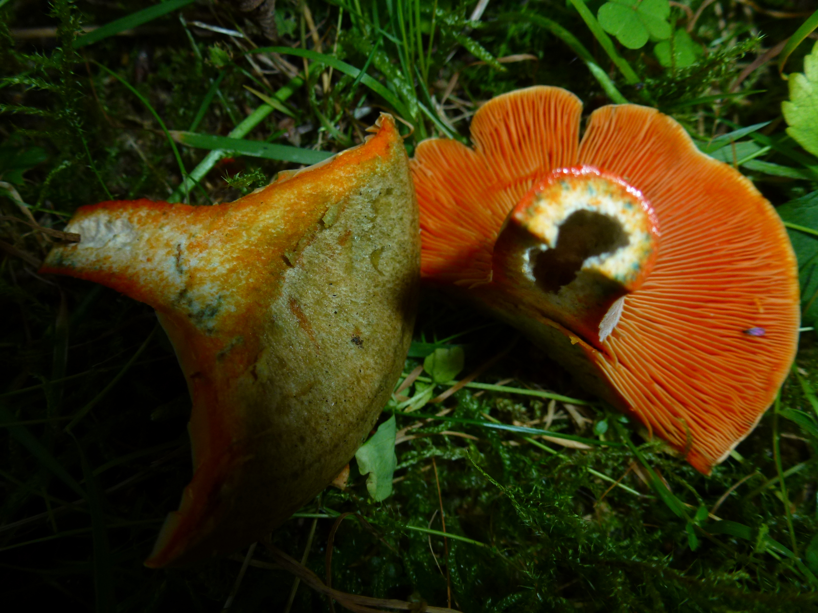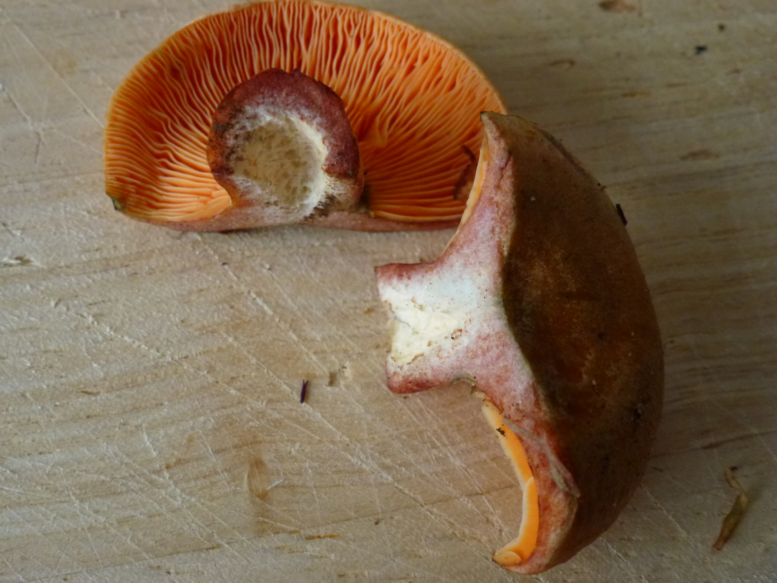 Milch nach Luftkontakt unverändert orangerot, nie weinrot werdend... Edelreizker (L. deliciosus) oder Düsterer Edelreizker (L. quieticolor)