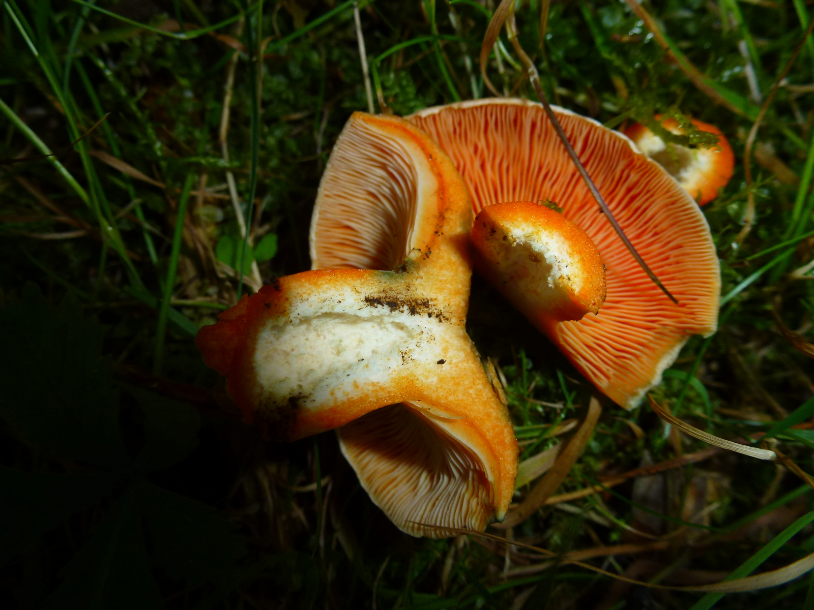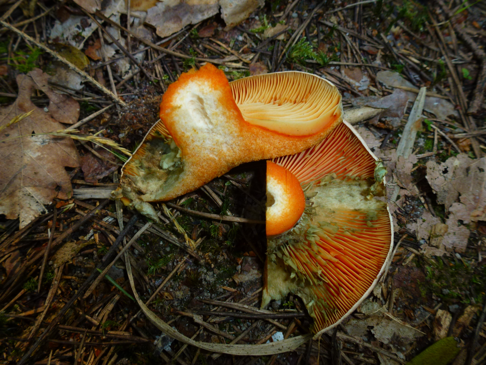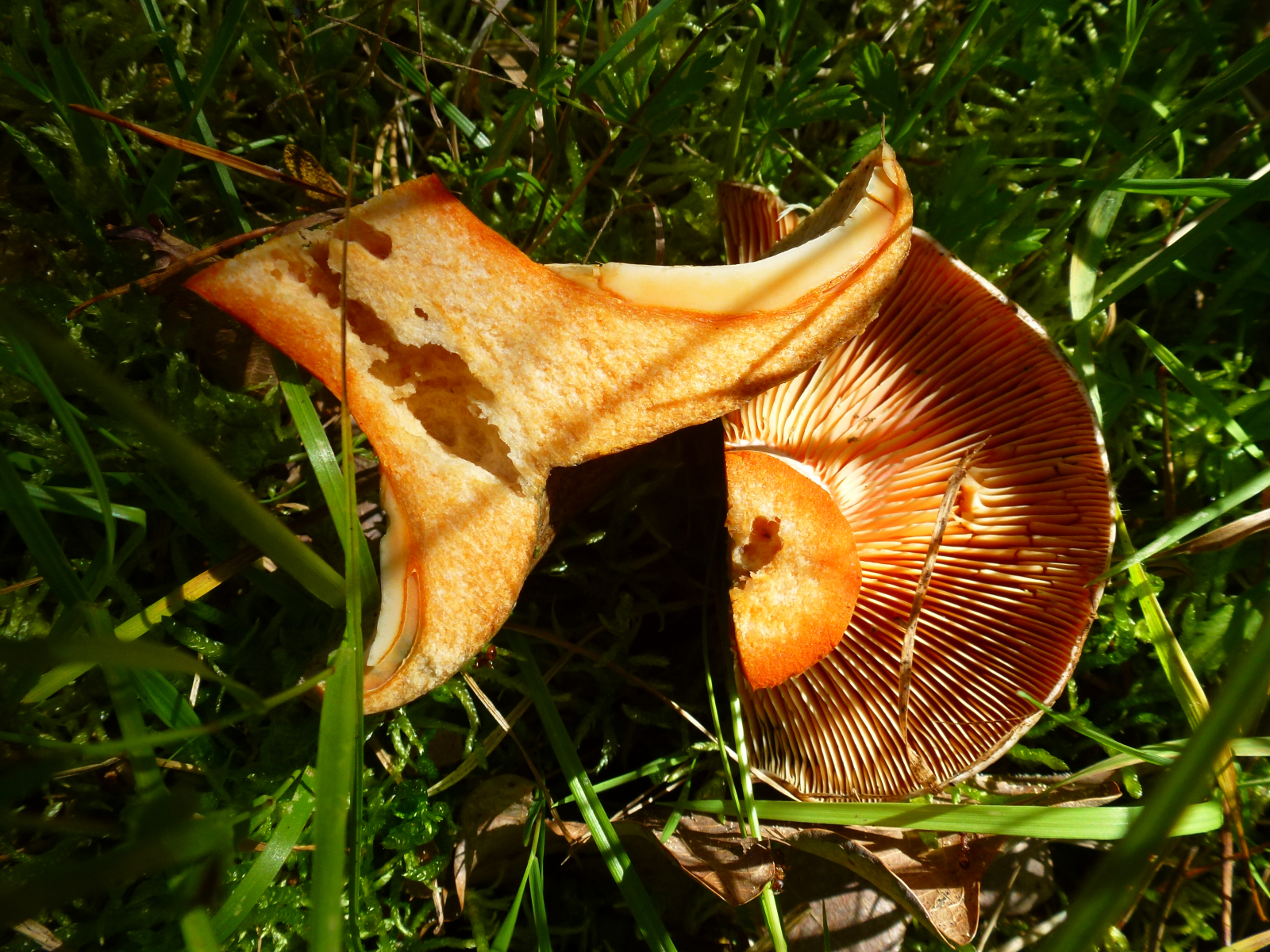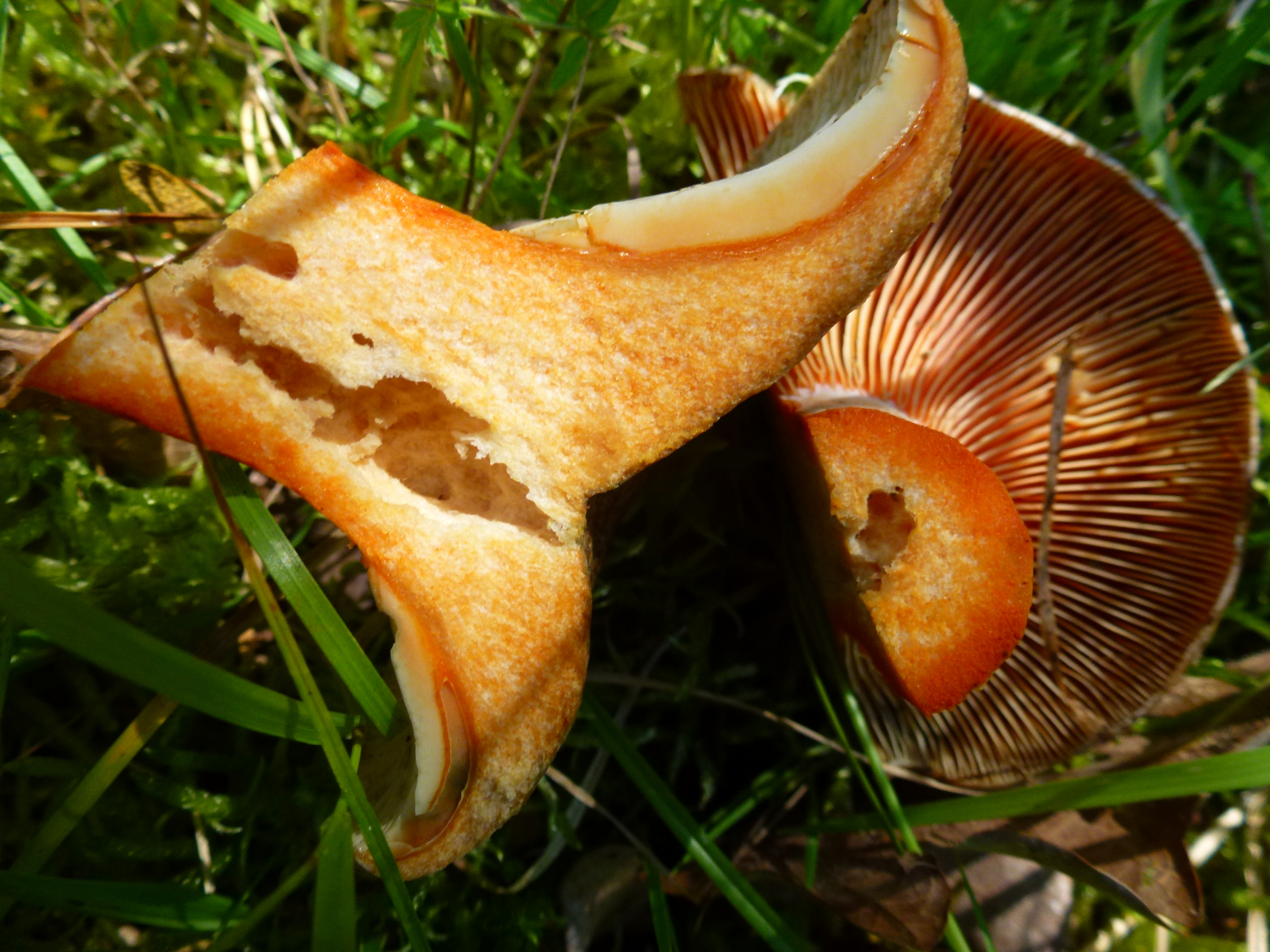 Milch nach Luftkontakt unverändert orangerot, nie weinrot werdend... Edelreizker (L. deliciosus) oder Düsterer Edelreizker (L. quieticolor)