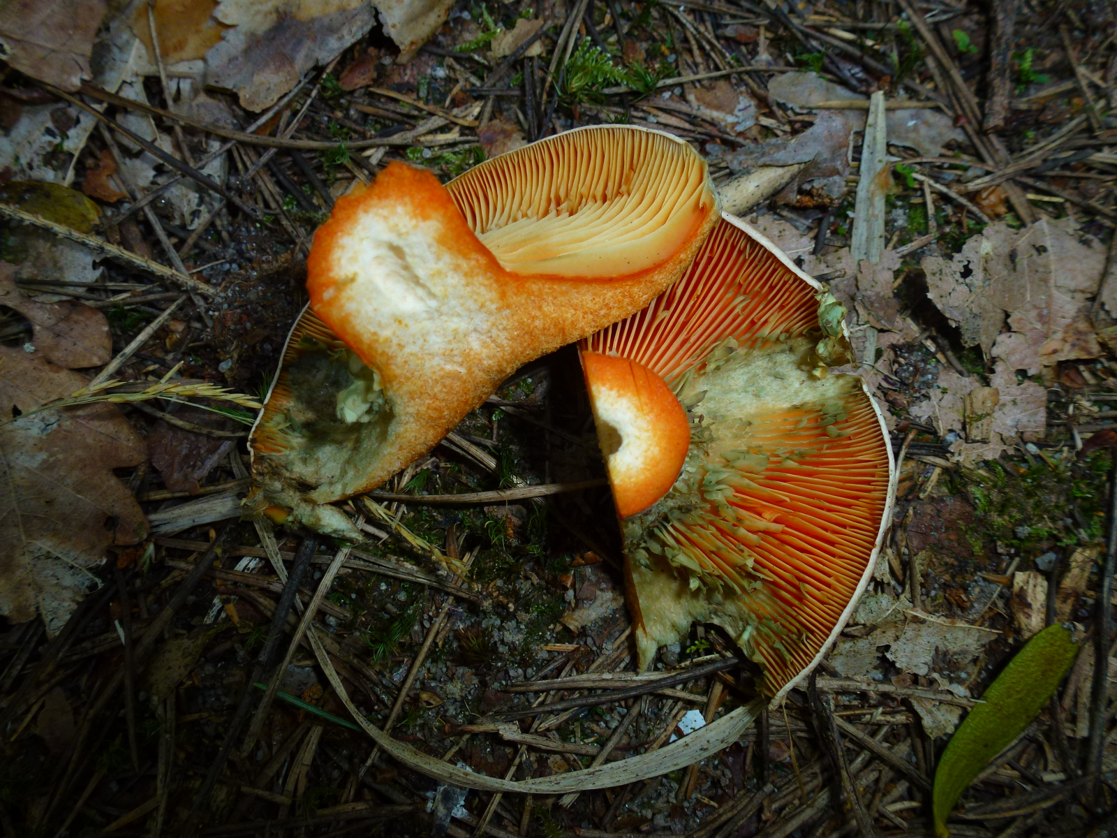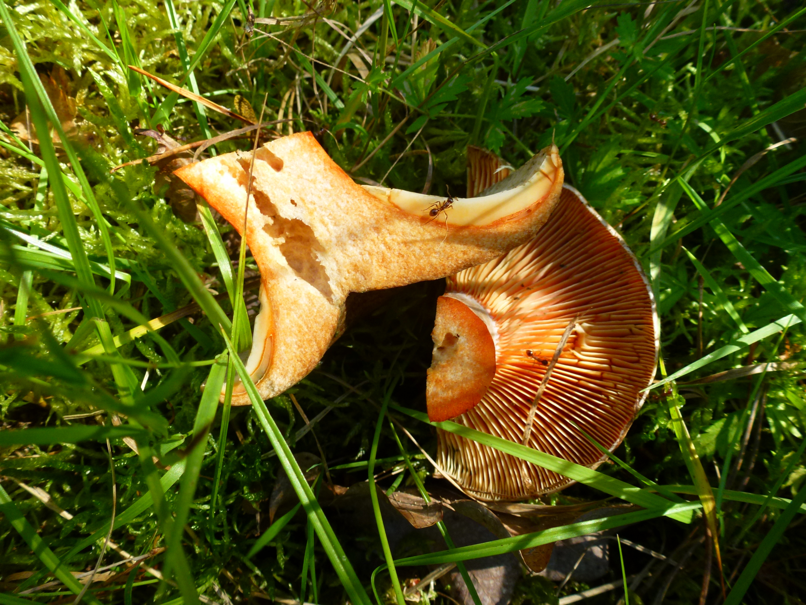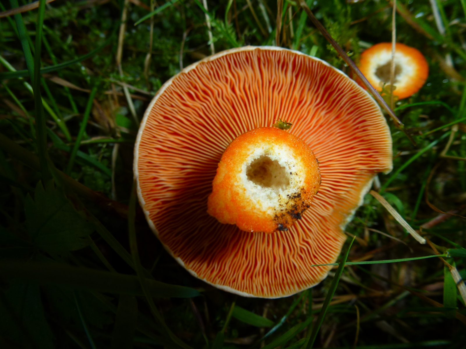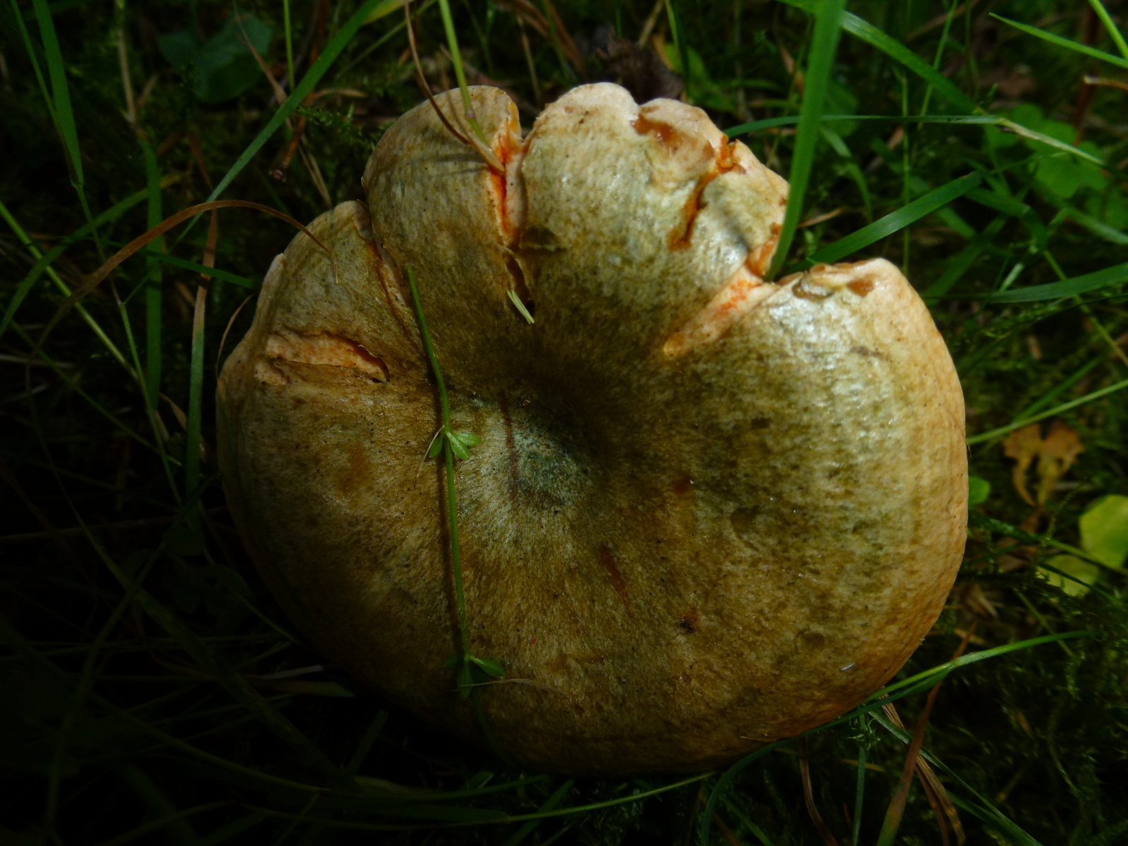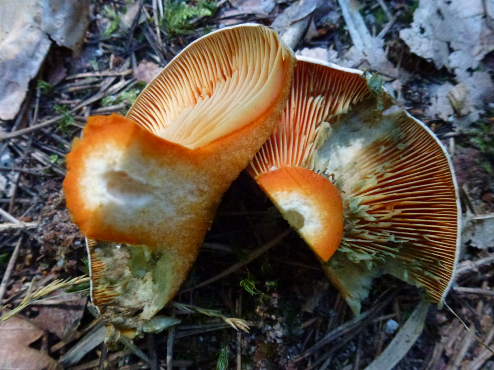 Milch nach Luftkontakt unverändert orangerot, nie weinrot werdend... Edelreizker (L. deliciosus) oder Düsterer Edelreizker (L. quieticolor)
