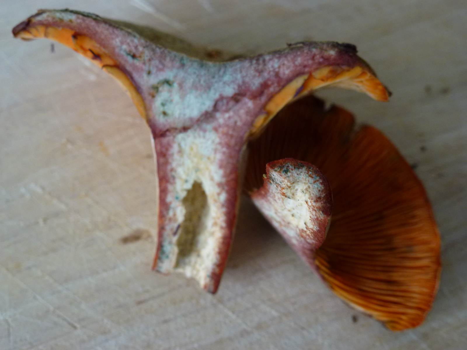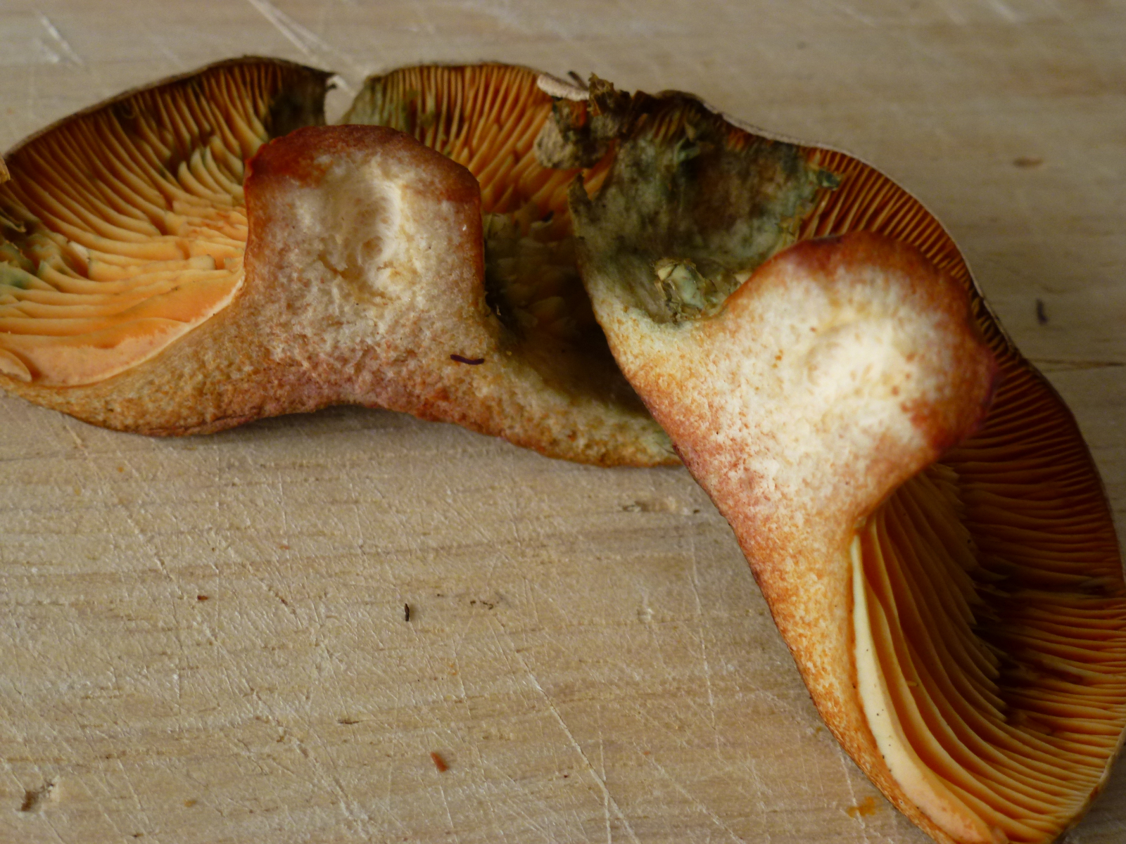 Aber die sind ja auch ziemlich angeknabbert an den Lamellen. Ich setze jetzt mal voraus, daß diese grün verfärbten verletzungsstellen schon vorhanden waren, als du die Pilze gefunden hast?