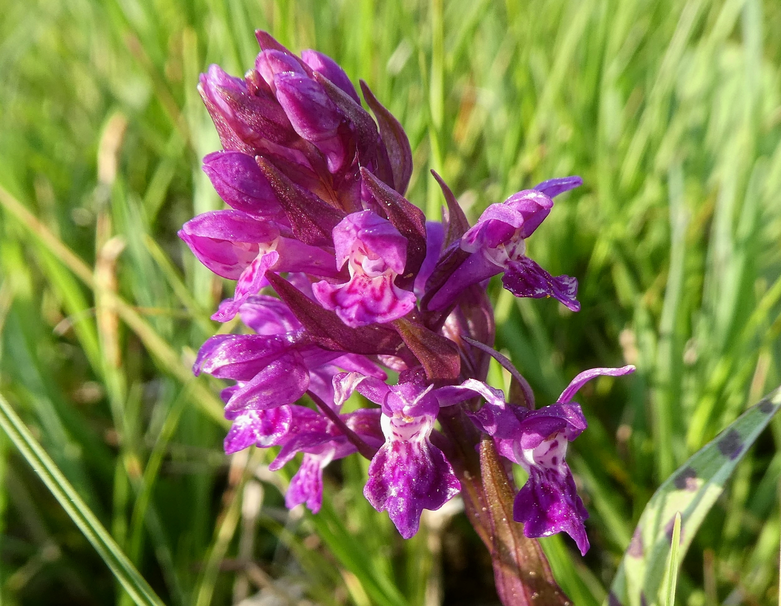 Auch das massenhaft vorkommende Breitblättrige Knabenkraut (Dactylorhiza majalis) sieht man aufgrund der geringen Höhe im nun höheren Gras oft erst aus kurzer Distanz.