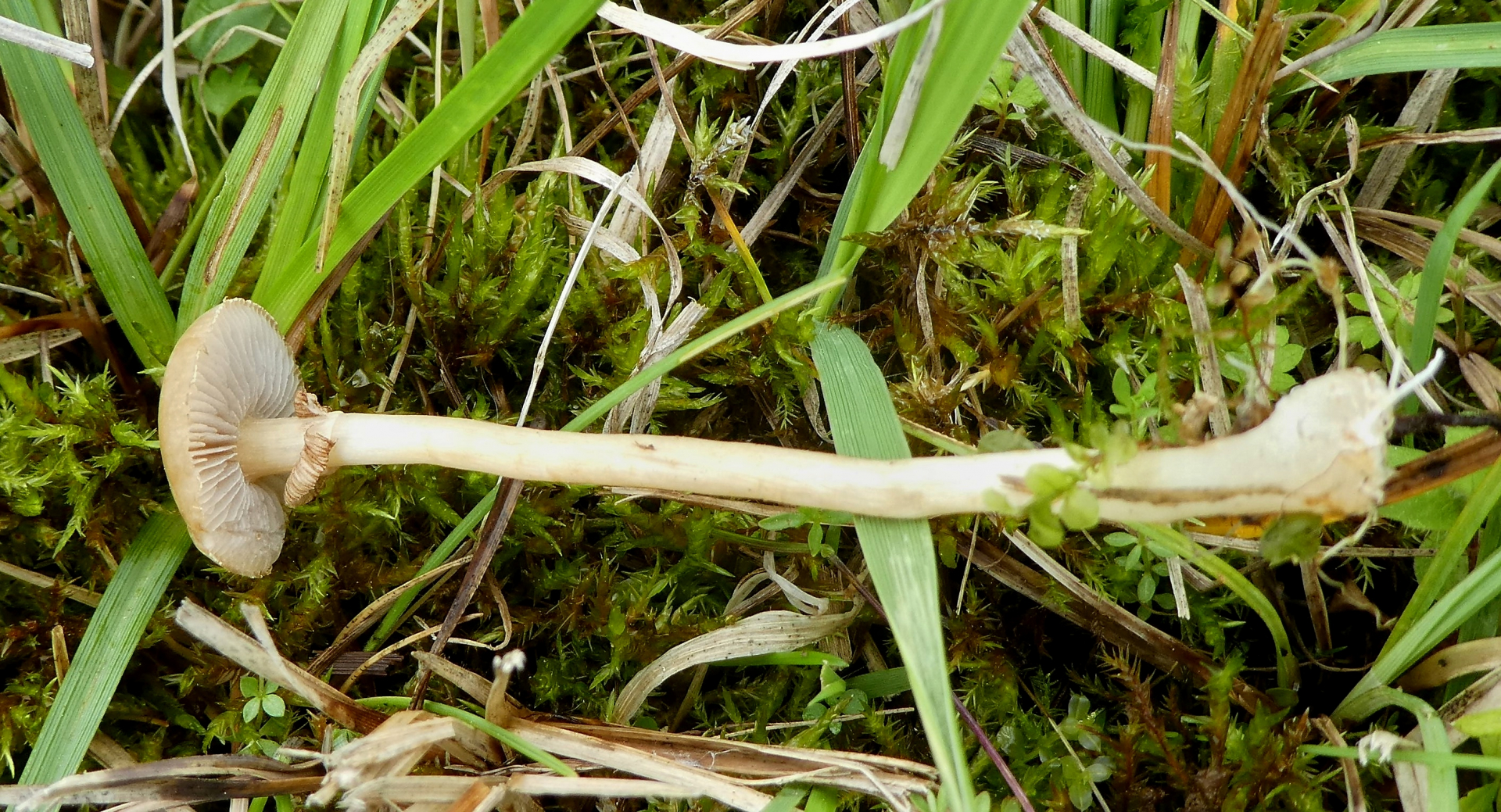 Dieser Pilz wuchs am Rande des Moores neben Gebüsch und einem geschotterten Weg im Gras. Auch hier konnte ich keinen Geruch feststellen. Hutdurchmesser ca. 2 cm, Höhe ca. 6 cm wobei mir der Stiel abgebrochen ist - leider.