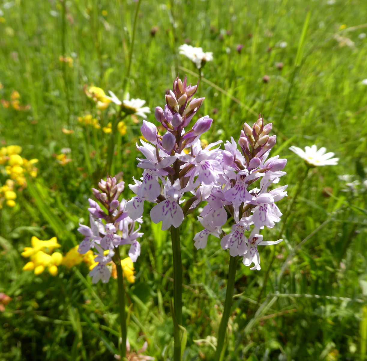 Im zweiten Habitat, naja eigentlich hier in der ganzen Gegend, wachsen unter anderem die Fuchs’ Knabenkräuter (Dactylorhiza fuchsii) inklusive der diversen Hybriden und Albinoformen. Leider waren die Händelwurzen noch nicht so weit, deren Blüte kommt erst in Kürze.