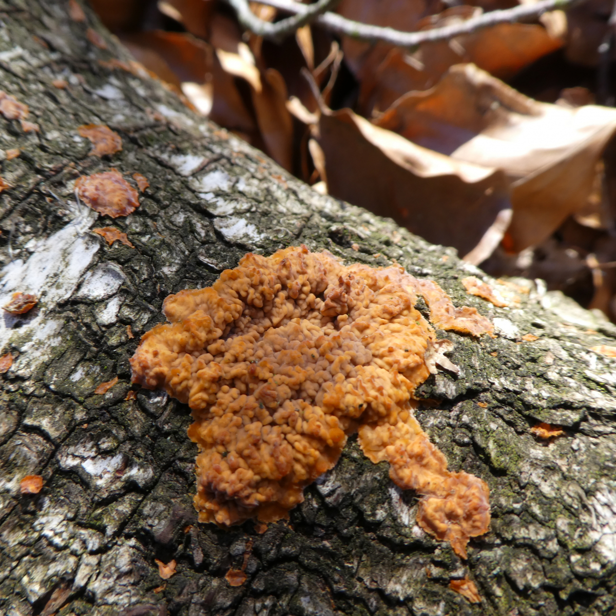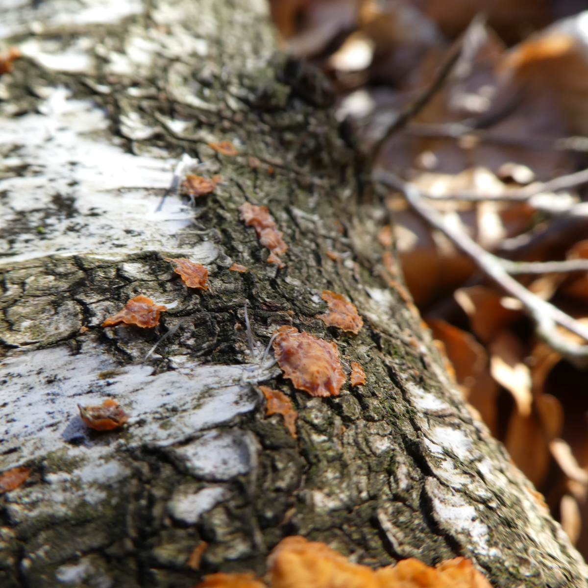 als ich diesen Pilz aus einiger Entfernung sah, dachte ich, dass dies wieder einer der zahllosen Orangeroten Kammpilze ist. Allerdings hatte ich den noch nie an Birke gesehen und so machte ich ein paar Fotos, wurde dann aber durch eine Herde Gämsen abgelenkt.