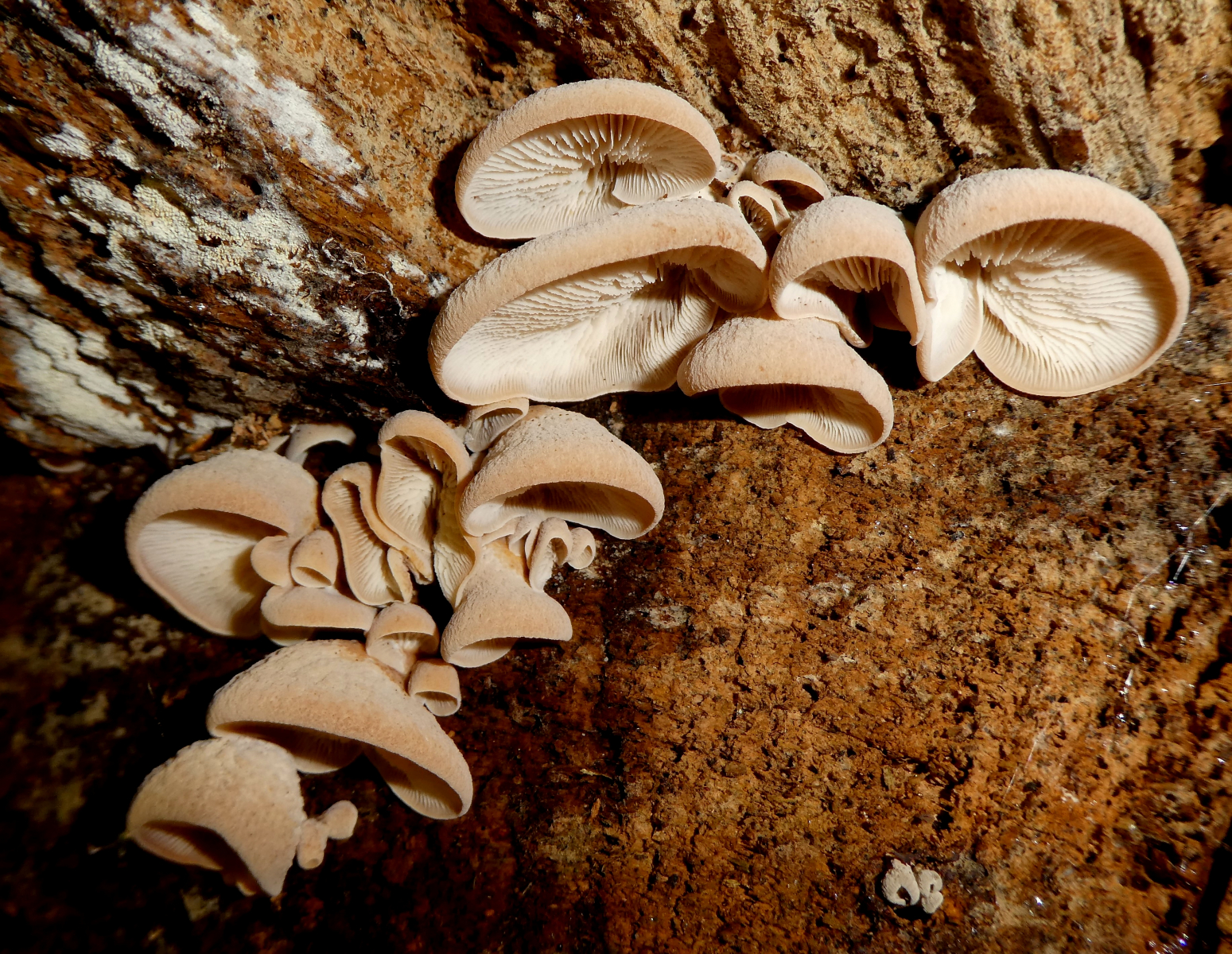 Die Pilze wachsen an einem am Boden liegenden Baumstamm, ich denke eine Rotbuche, in einem Mischwald. Am Stamm wachsen eine Vielzahl von Pilzen, darunter Austern-Seitlinge (glaube ich zumindest dass diese alten, tiefgefrorenen Pilze welche sind) und in etwa drei Meter Abstand auch eindeutige Laubholzhörnlinge.