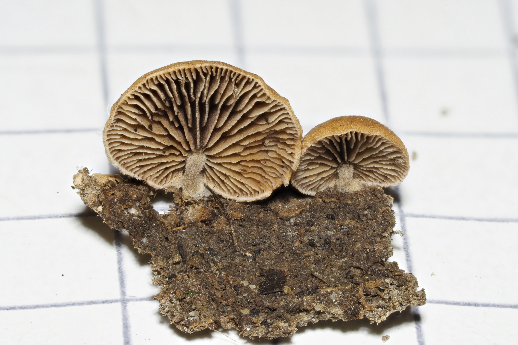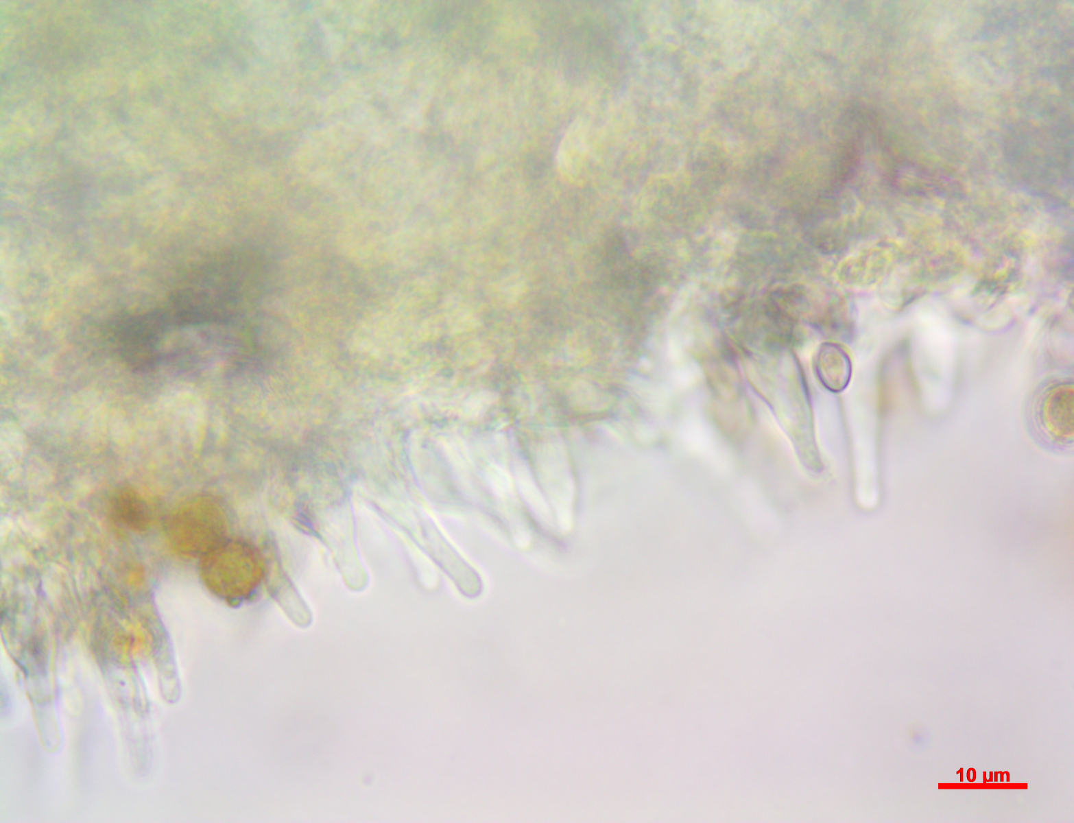 für Agrocybe firma sind die Sporen auch zu klein, und die Sporenform will eh nicht soganz zu Agrocybe passen, aber Jan-Arne's Vorschlag passt sehr gut, die Cheilo/Pleuro 's mit apikal dicker Wand, die gelblich erscheint, er soll zwar kristallschöpfe an den Zystiden haben, da habe ich nichts, bzw. nur ganz wenige kleine Anhaftungen gefunden, die ich aber nicht als Kristalle deuten konnte. Auch soll er reichlich Pleuro's haben, wie schon erwähnt sind bei meinem Fund sehr wenige vorhanden. Zu Homophron spadiceum syn. Psathyrella spadicea passt auch ein feinfilziger Hutrand, aber dass sich die Sporen in Koh strohgelb verfärben (s. Ludwig) sollen passt wiederum nicht.
