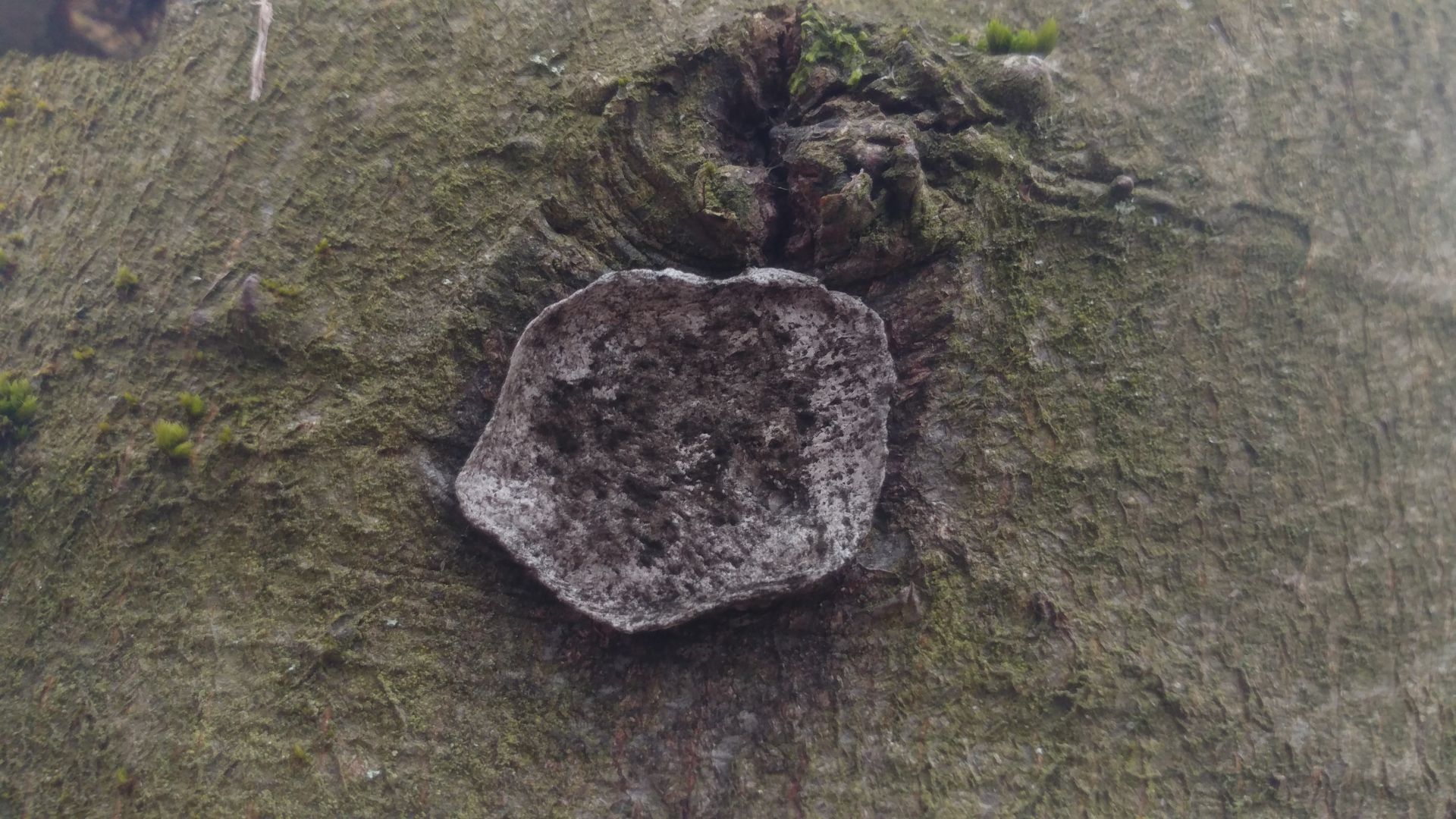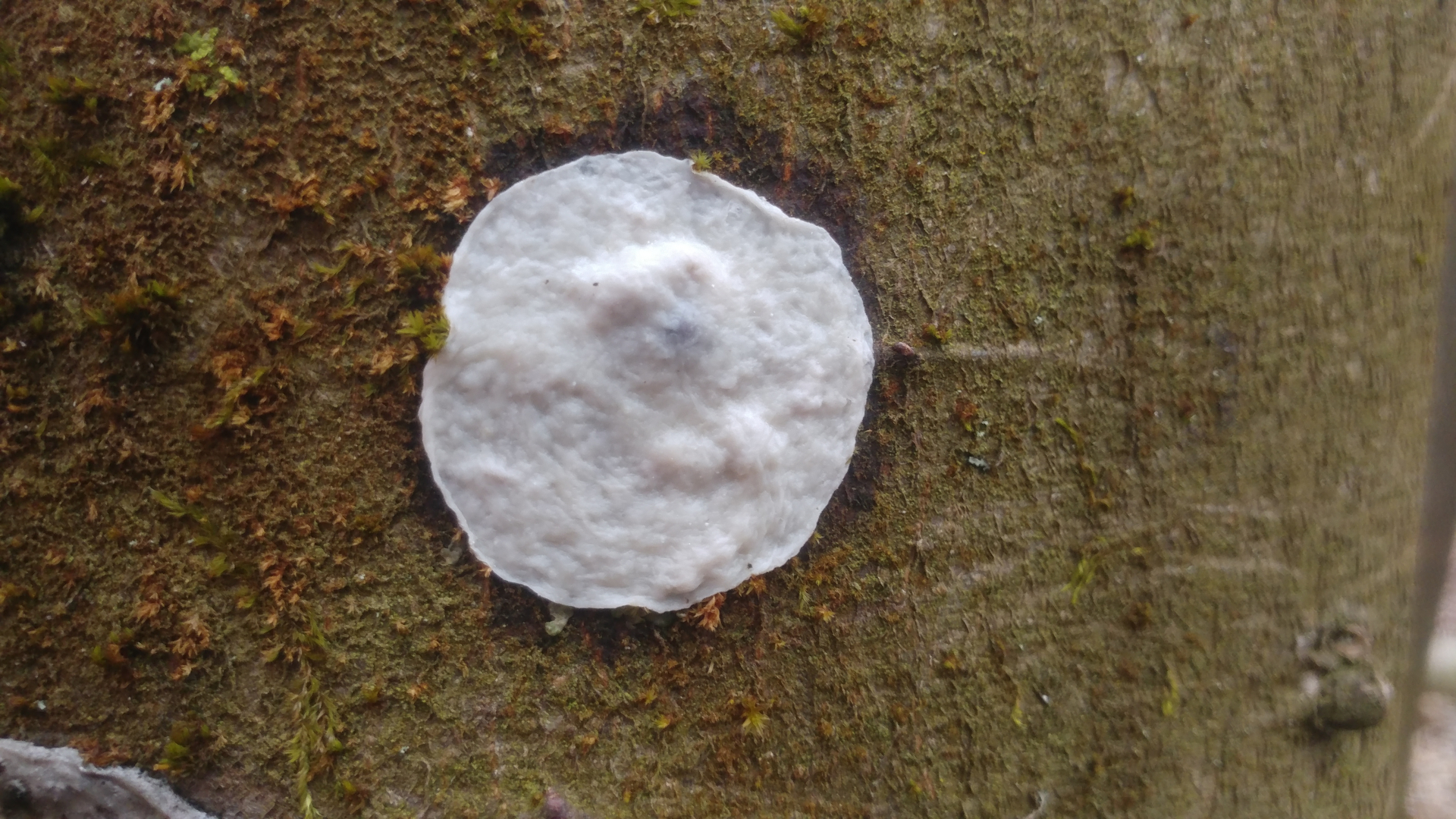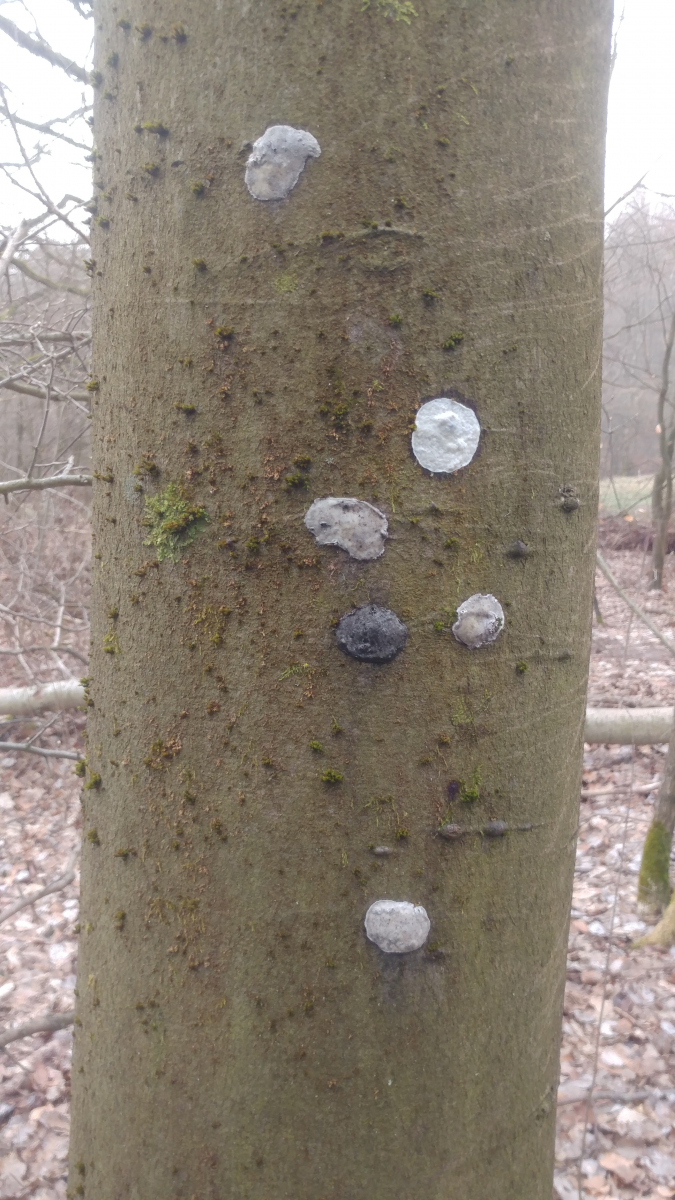 Genau an einer solchen Mülltüte entdeckte ich an einer Buche (? siehe Knospe) diesen weißen Pilz, eine flüchtige Bild-Suche auf 123Pilze ergab erst mal kein Ergebnis.