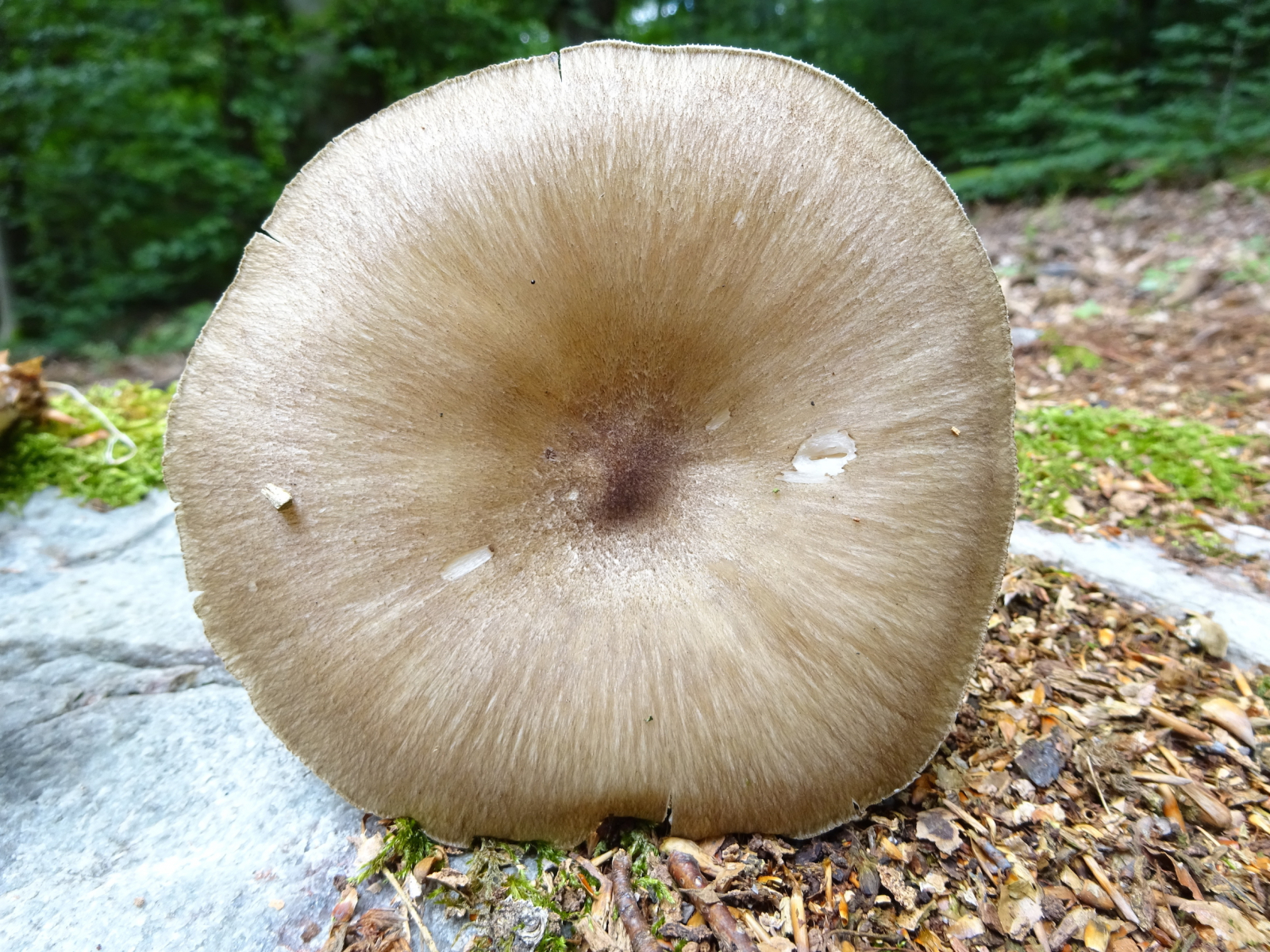 Ich habe gestern folgenden Pilz auf einer Wiese im Wald gefunden, daneben war ein Weg mit Holzschrot.