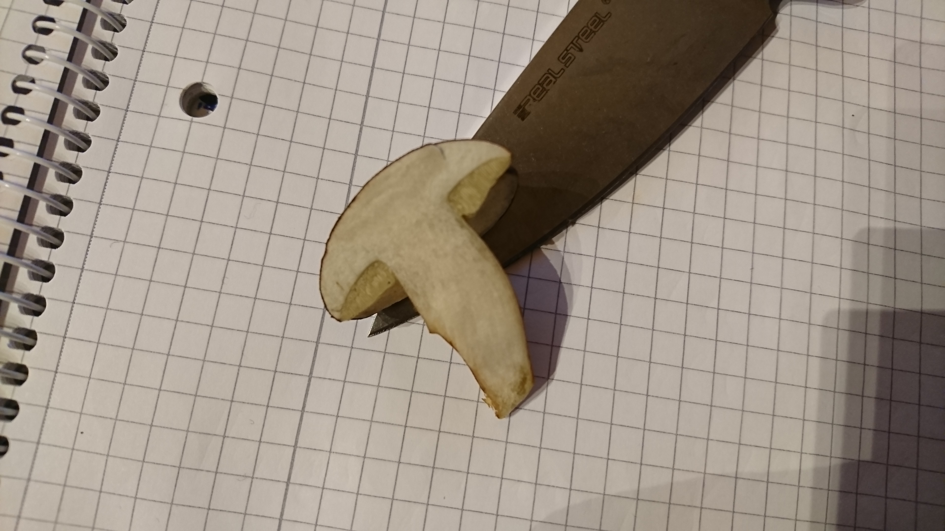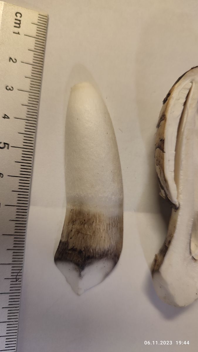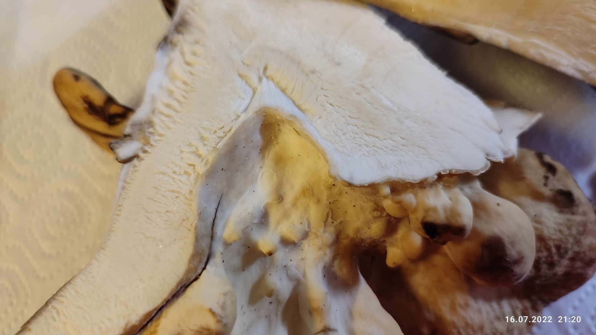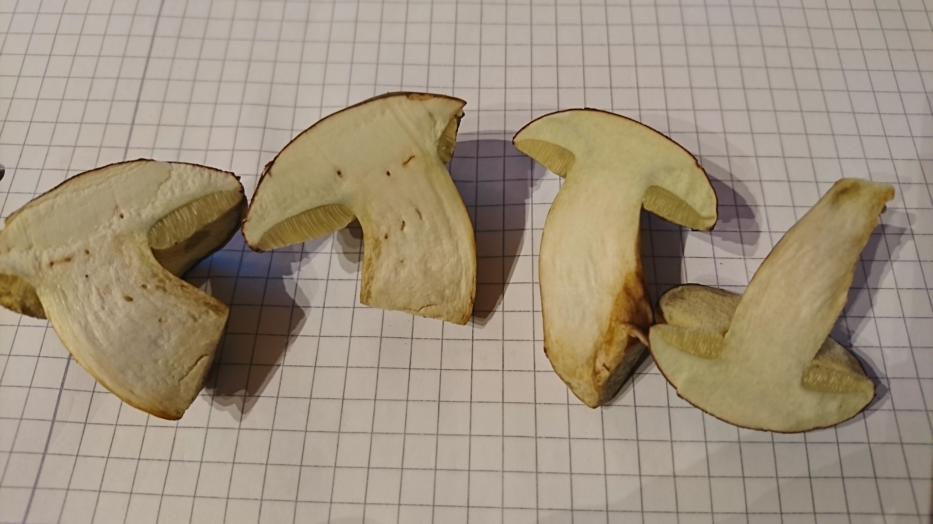 Fleisch: Nach Schnitt reinweiß, langsam färbend dunkelbraun...schwarz, am "Stiel" tritt ein Saft wie Wasser (also keine Milch) aus.