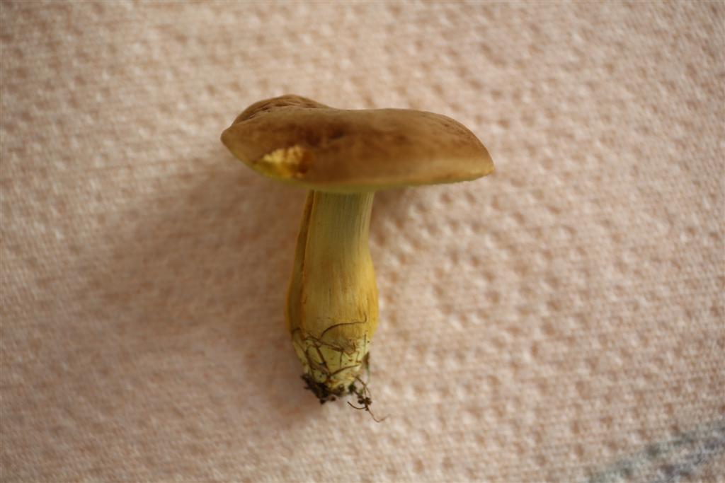 Er hat einen gelben Fuß und einen braunen Hut.