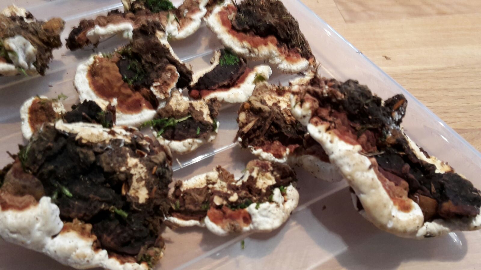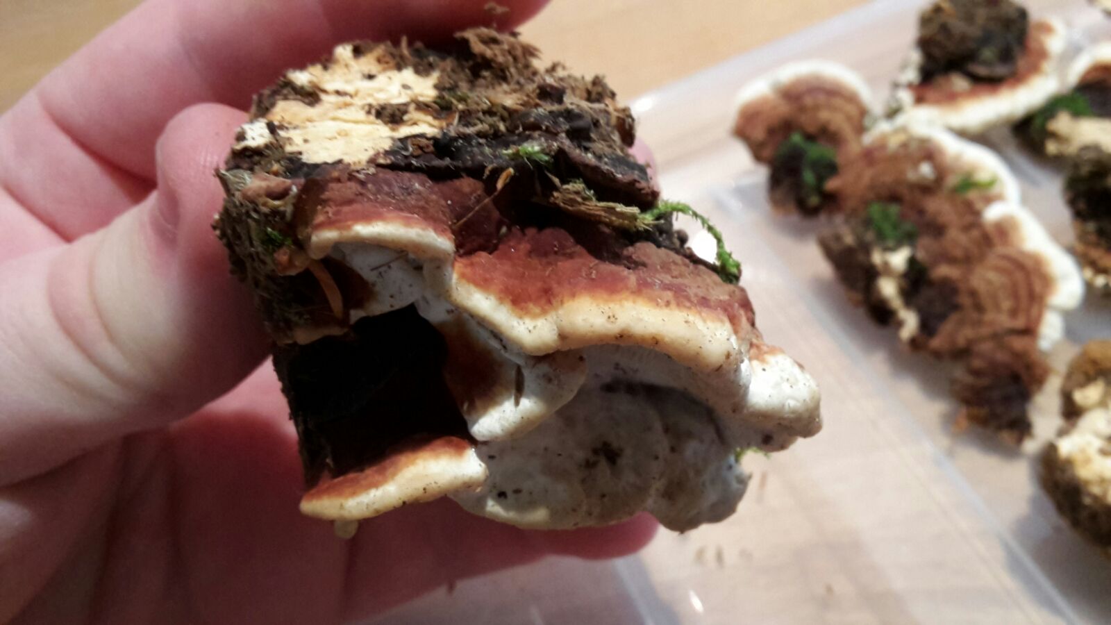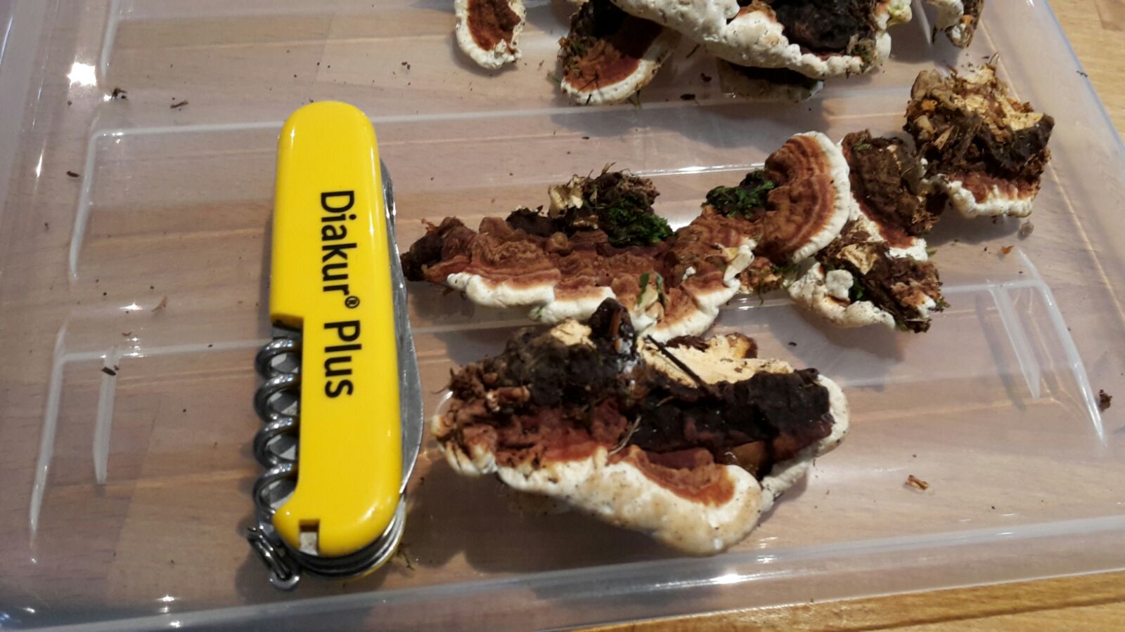 Die wuchsen auf den Stümpfen zweier gefällter Bäume die komplett mit Moos bewachsen waren. Sofort mitnehmen - tja wäre ich Pilzexperte hätte ich das wohl nicht getan, mein Bekannter der meine Pilze immer wieder anschaut meinte dass der Pilz als Heilpilz eben begehrt ist. Dementsprechend dachte ich "besser mal von zwei Stümpfen mitnehmen" da im Umkreis jeder andere Baumstumpf den selben Pilzbewuchs aufwies und ich mir dachte dass die Menge hier nicht verkehrt ist.